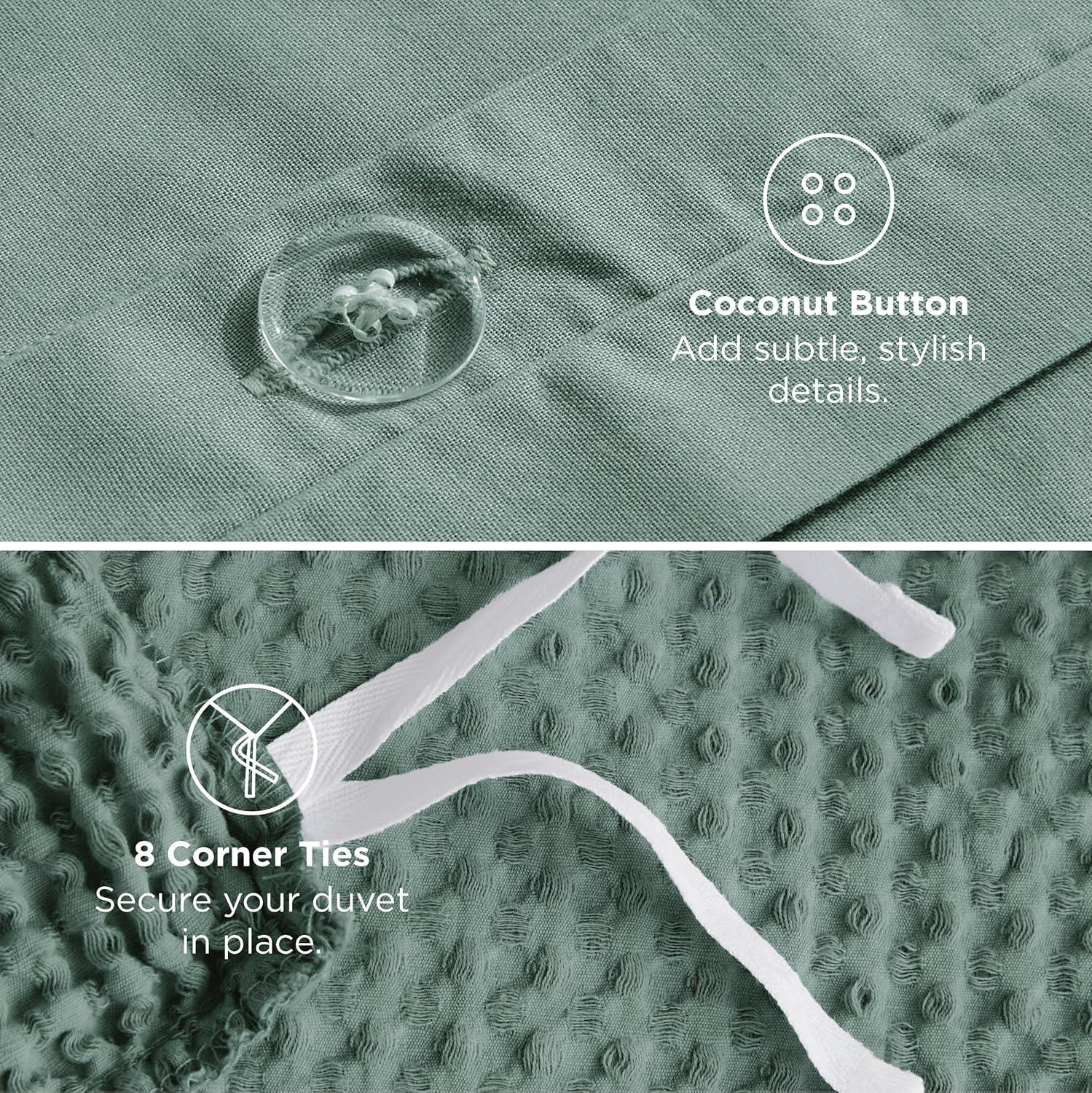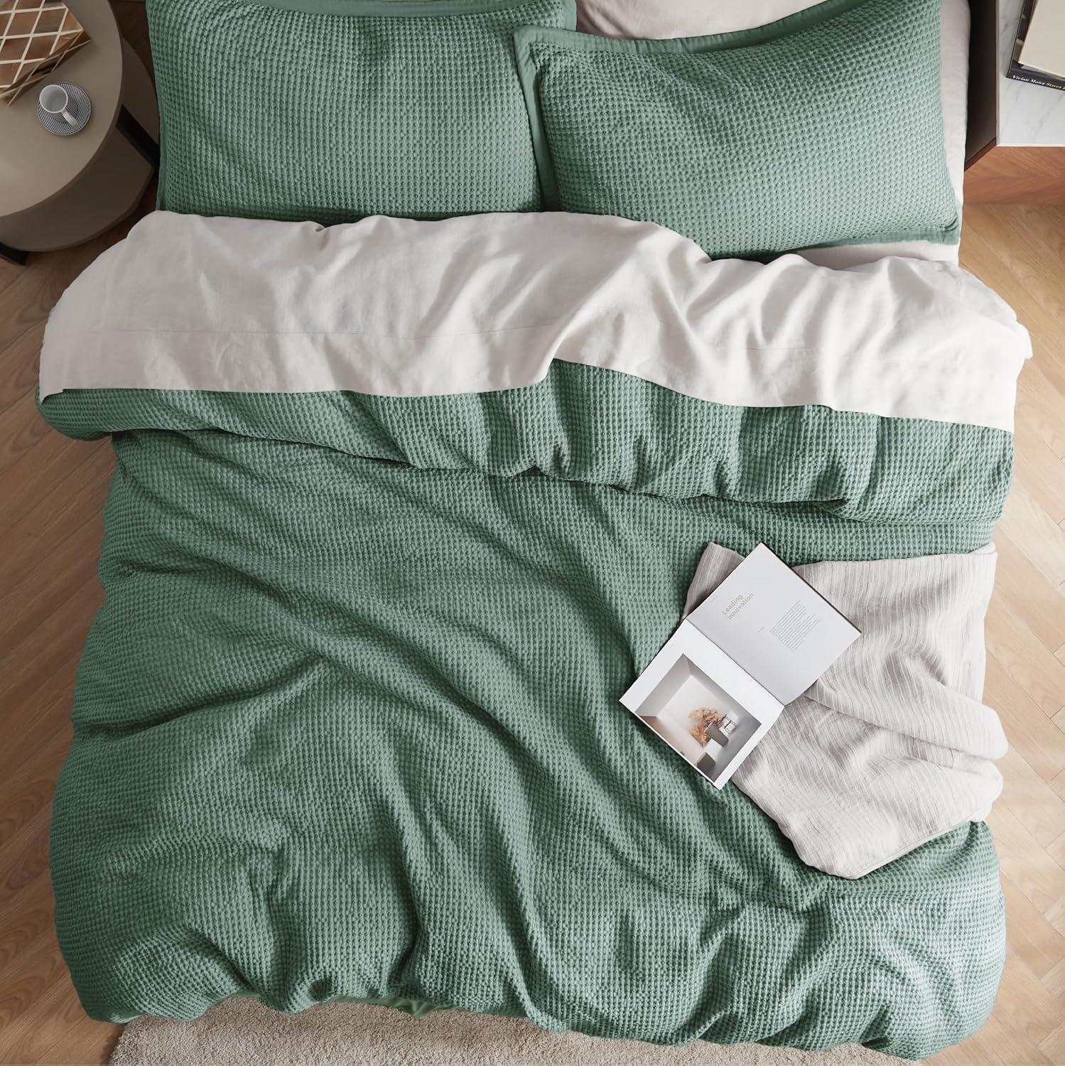 Bedsure 100% Cotton Duvet Cover Queen Size with Fitted Sheet - 4 Pieces Coconut White Waffle Weave Bedding Set, GentleSoft™ and Breathable, Includes 1 Duvet Cover 90x90, 1 Fitted Sheet, 2 Pillow Shams(12 - Green (No Comforter))
