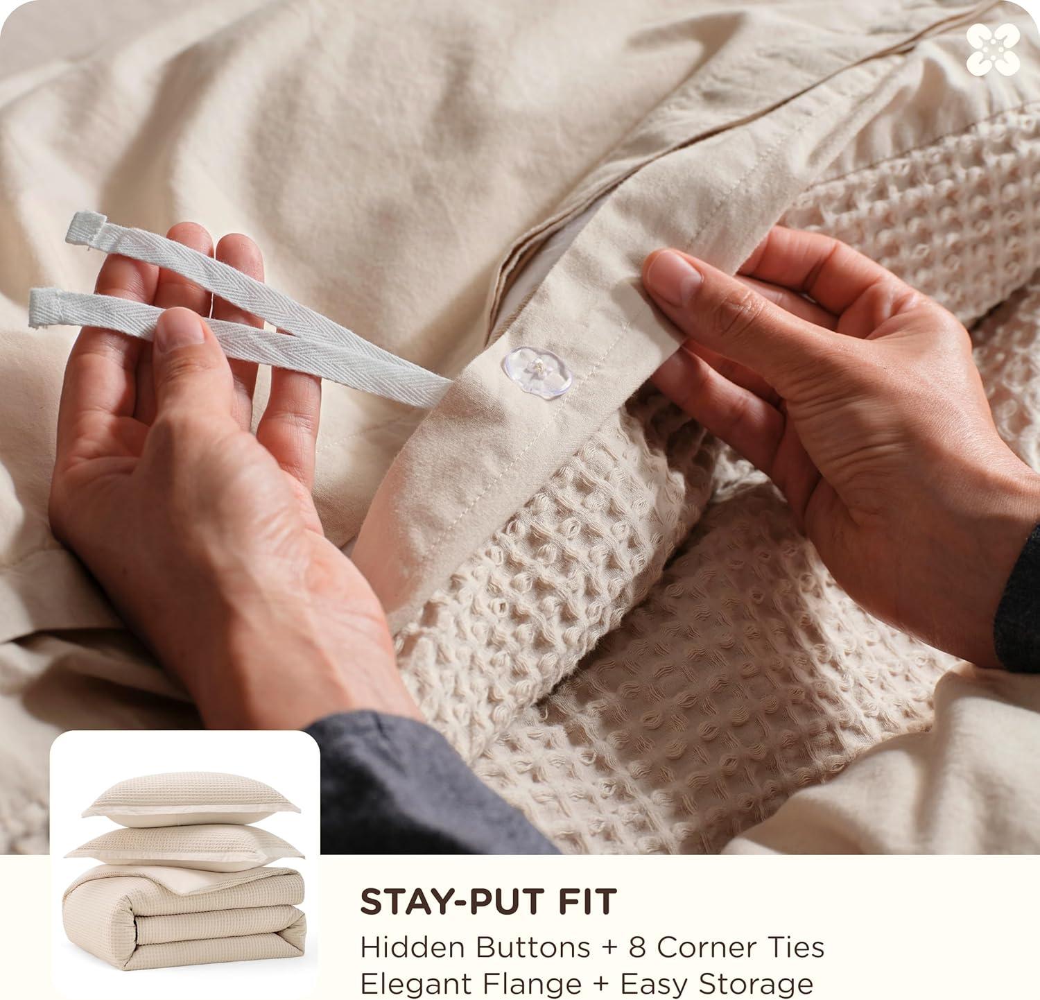 Bedsure 100% Cotton Duvet Cover Queen Size with Fitted Sheet – 4 Pieces Coconut White Waffle Weave Bedding Set, GentleSoft™ and Breathable, Includes 1 Duvet Cover 90×90, 1 Fitted Sheet, 2 Pillow Shams(04 – Linen (No Comforter))