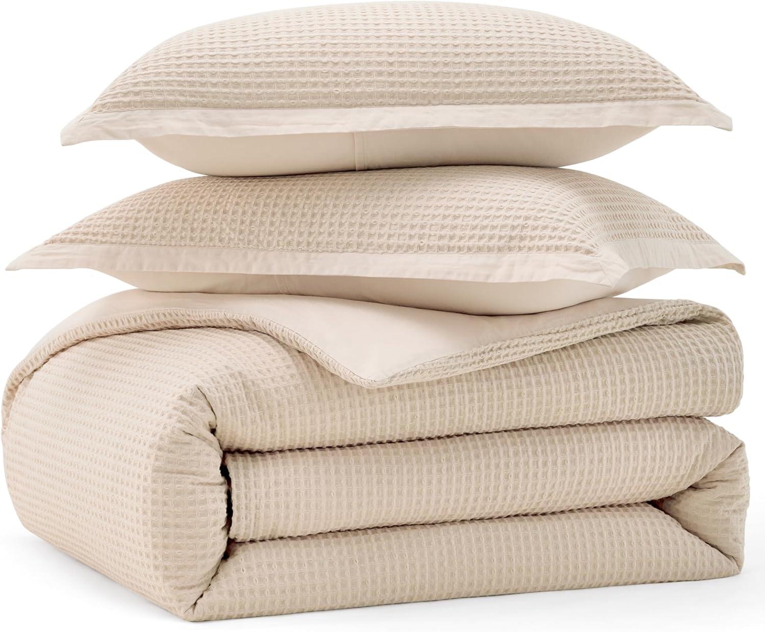 Bedsure 100% Cotton Duvet Cover Queen Size with Fitted Sheet - 4 Pieces Coconut White Waffle Weave Bedding Set, GentleSoft™ and Breathable, Includes 1 Duvet Cover 90x90, 1 Fitted Sheet, 2 Pillow Shams(03 - Beige (No Comforter))