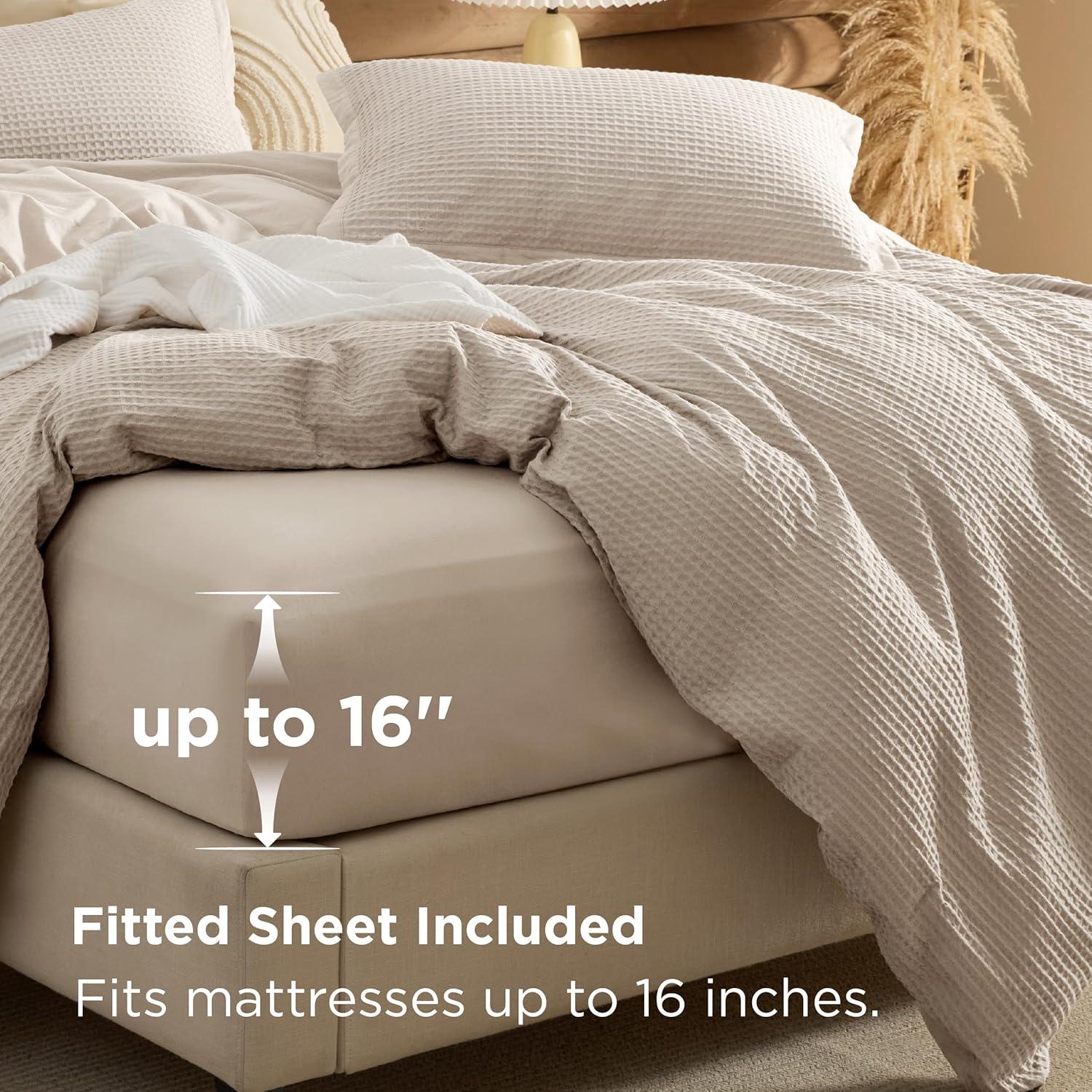 Bedsure 100% Cotton Duvet Cover Queen Size with Fitted Sheet – 4 Pieces Coconut White Waffle Weave Bedding Set, GentleSoft™ and Breathable, Includes 1 Duvet Cover 90×90, 1 Fitted Sheet, 2 Pillow Shams(04 – Linen (No Comforter))