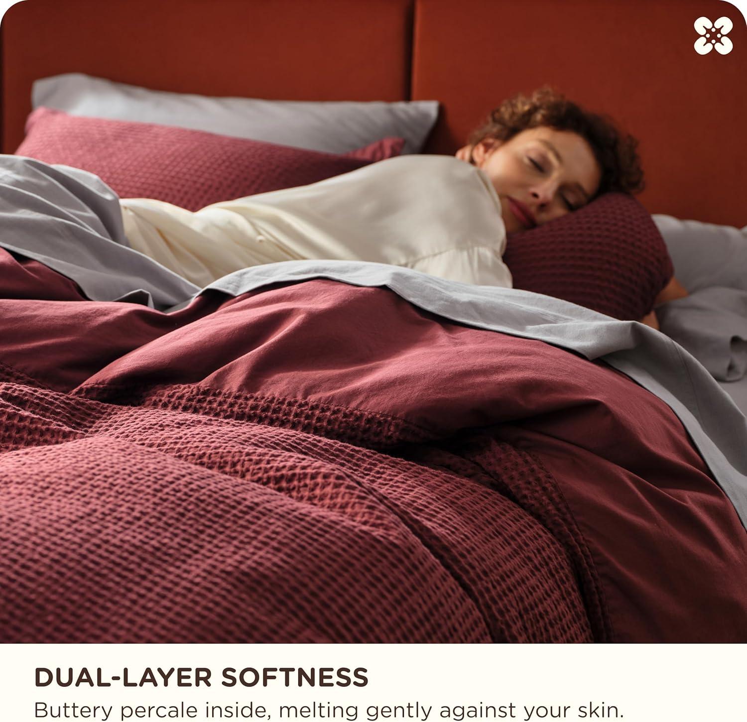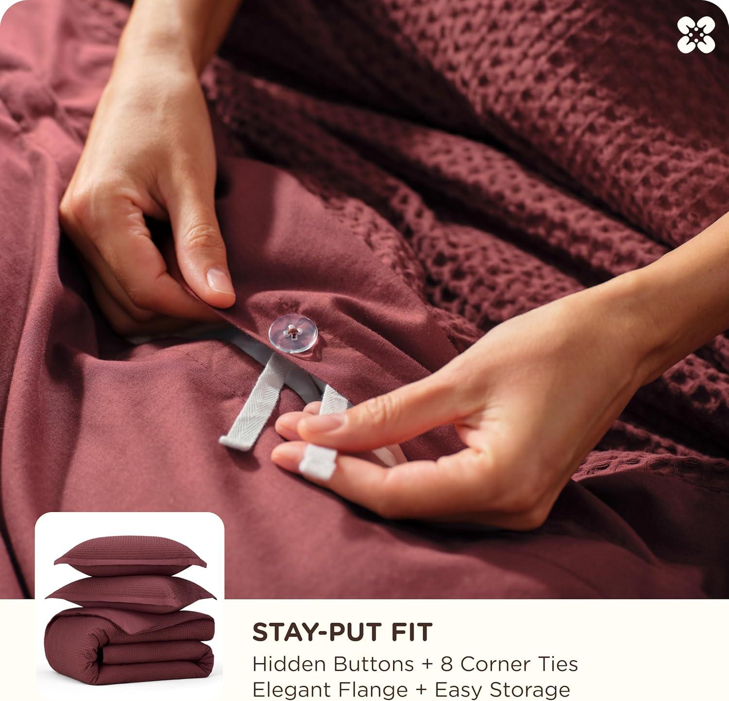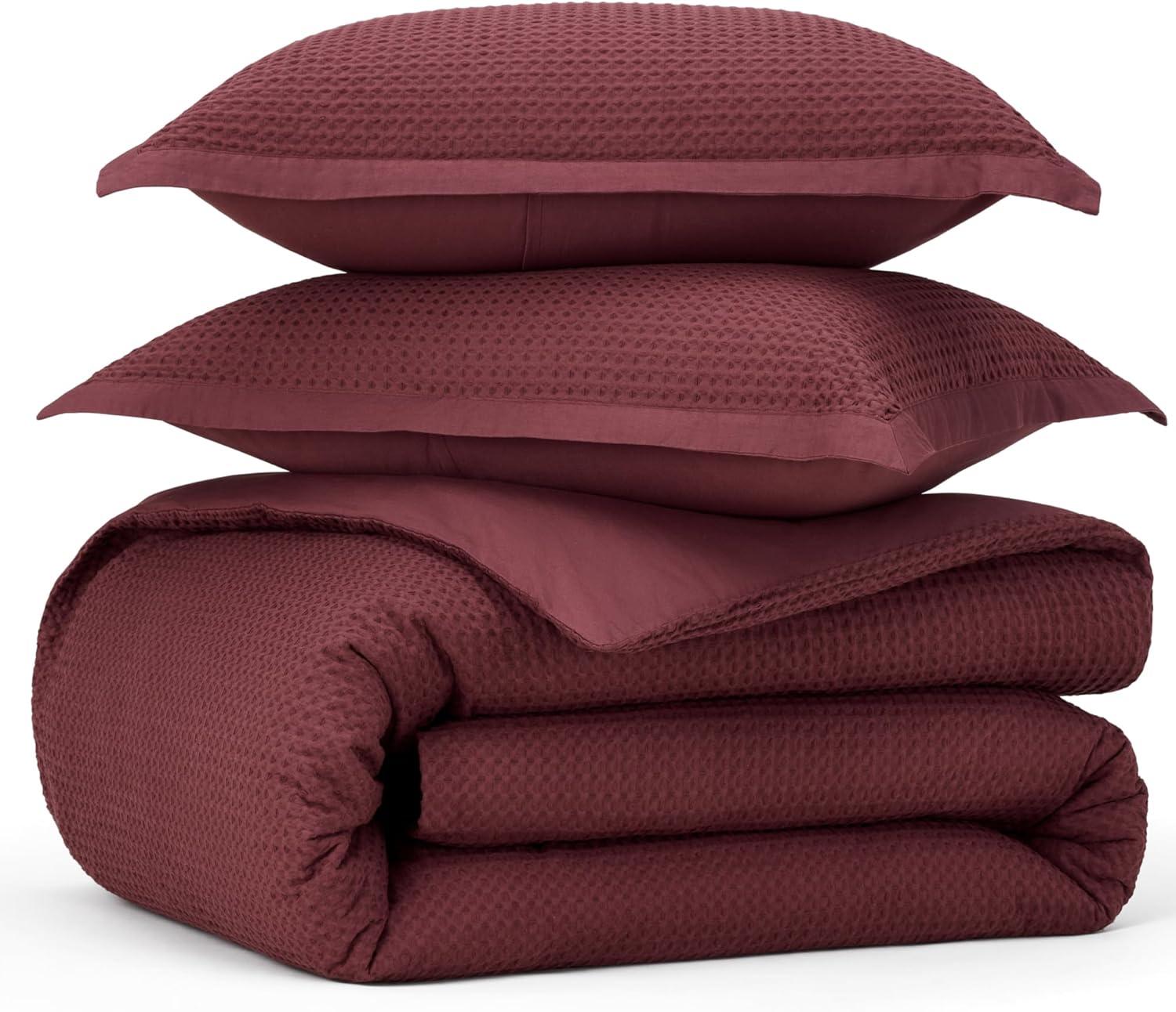 Bedsure 100% Cotton Duvet Cover Queen Size with Fitted Sheet - 4 Pieces Coconut White Waffle Weave Bedding Set, GentleSoft™ and Breathable, Includes 1 Duvet Cover 90x90, 1 Fitted Sheet, 2 Pillow Shams(08 - Maroon Red (No Comforter))