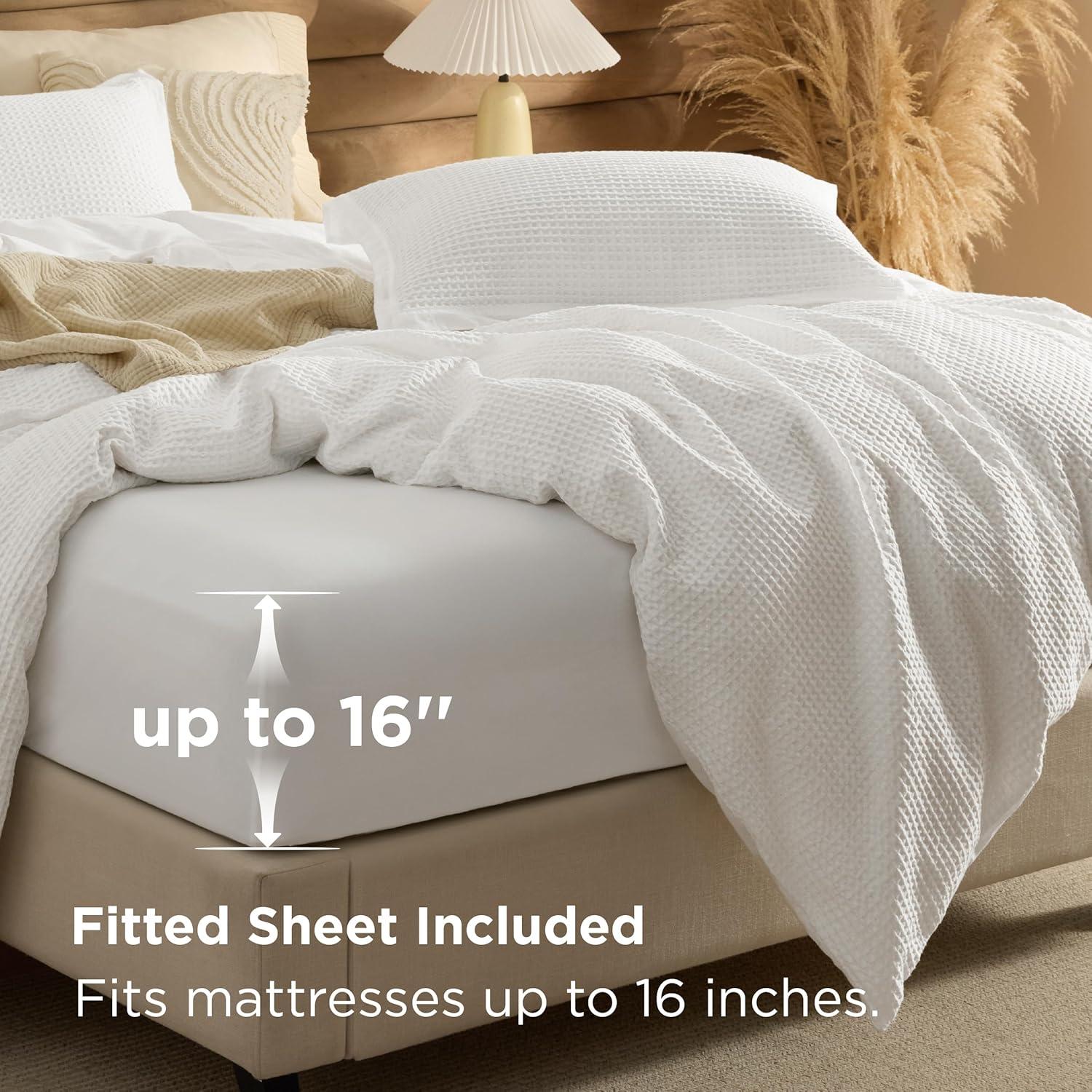 Bedsure 100% Cotton Duvet Cover Queen Size with Fitted Sheet – 4 Pieces Coconut White Waffle Weave Bedding Set, GentleSoft™ and Breathable, Includes 1 Duvet Cover 90×90, 1 Fitted Sheet, 2 Pillow Shams(02 – Bright White (No Comforter))