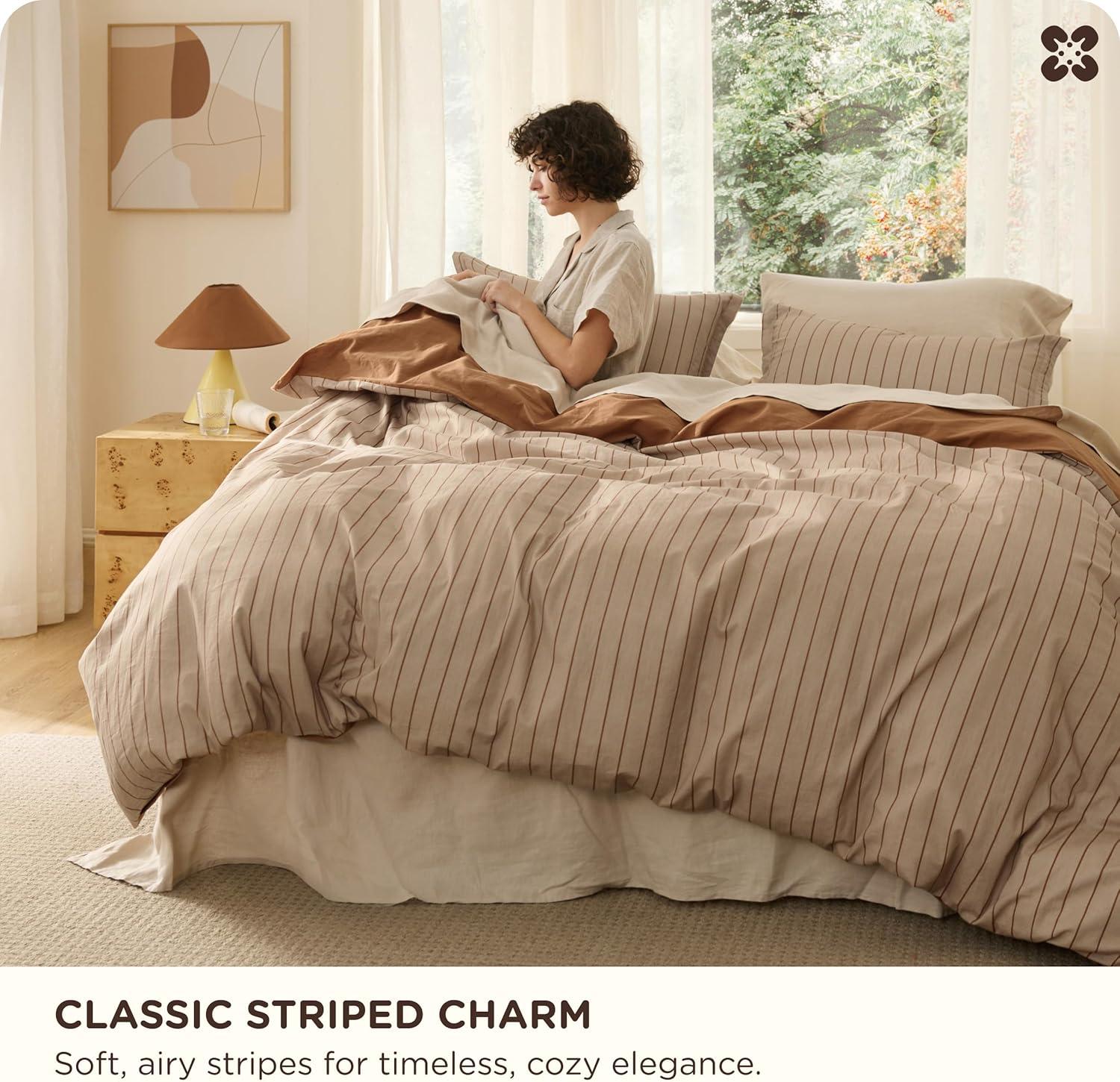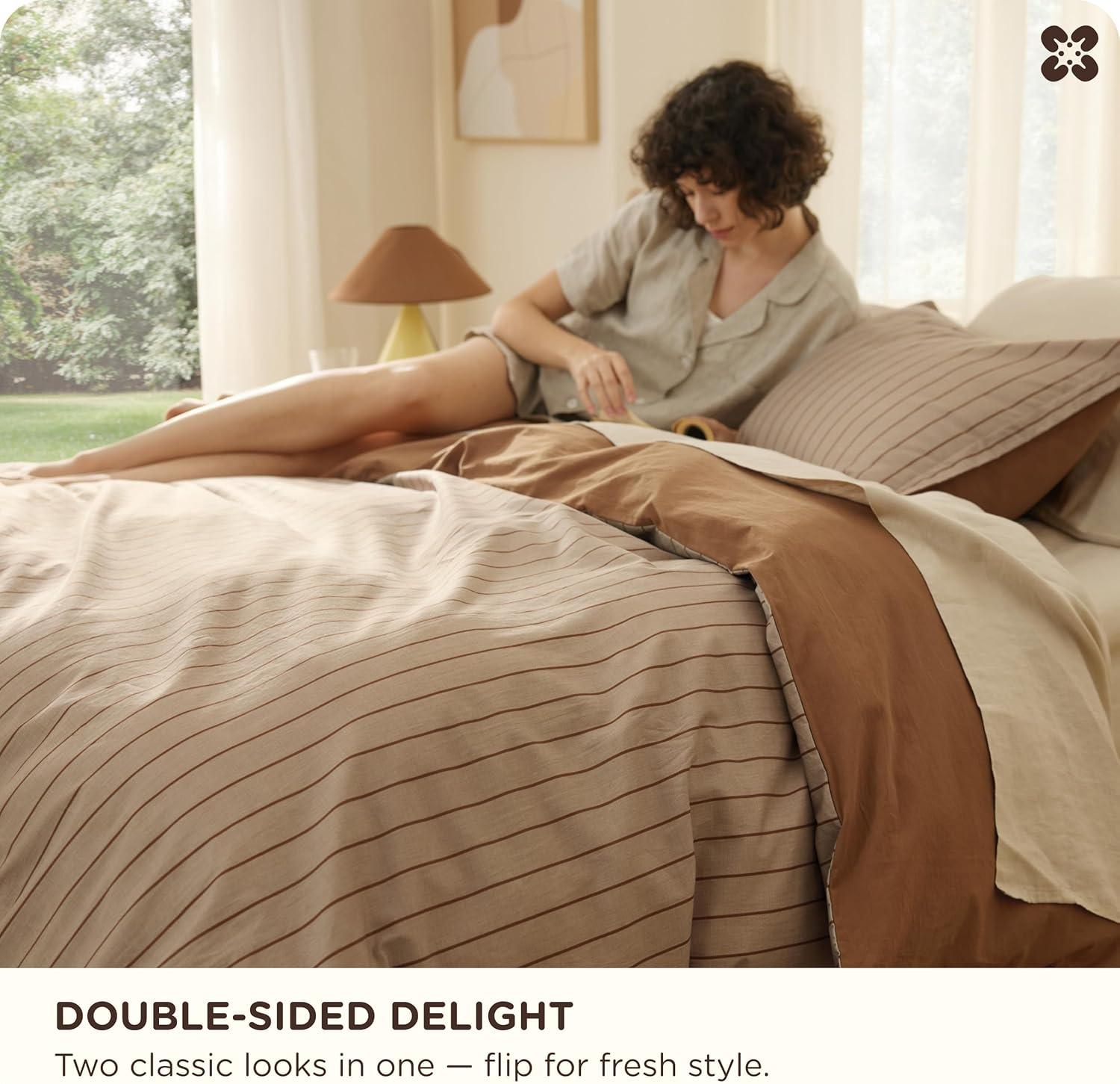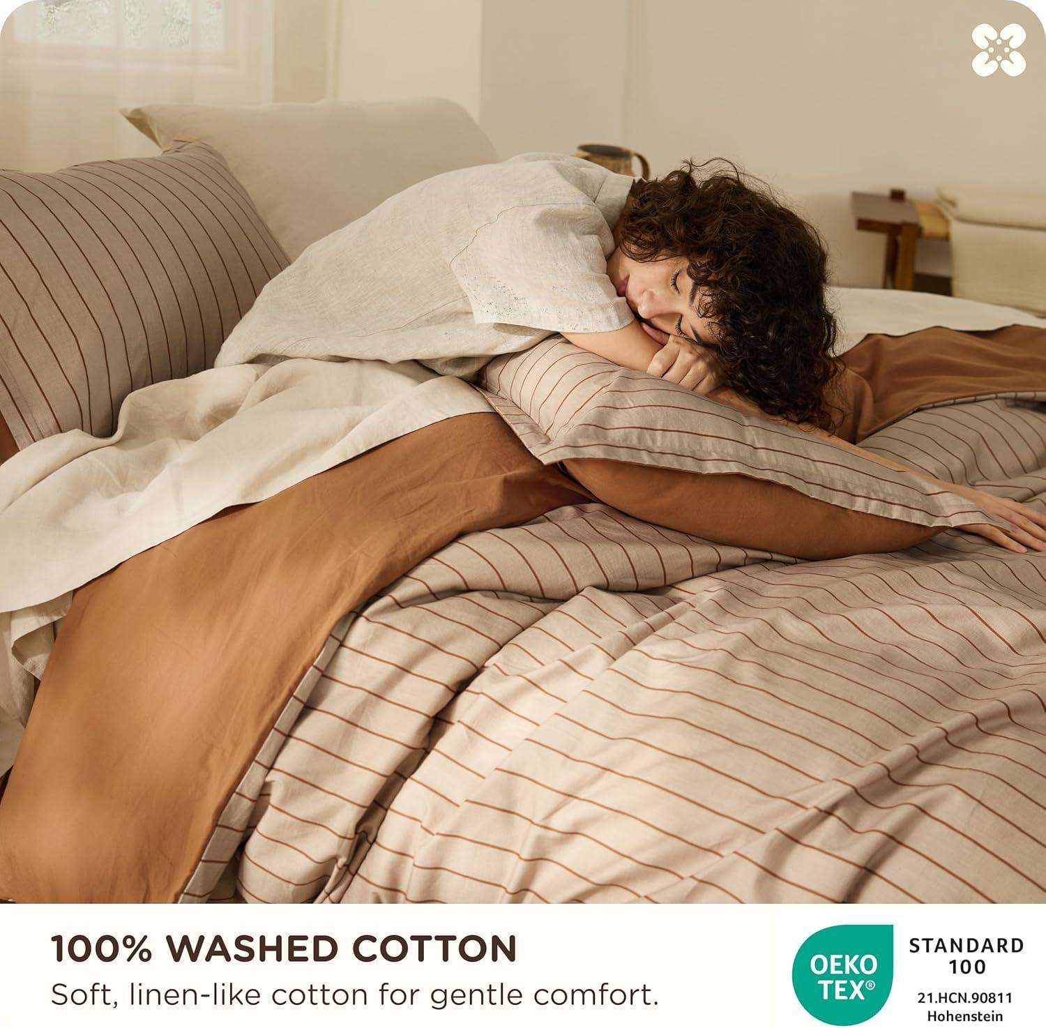 Bedsure 100% Washed Cotton Duvet Cover Queen Size, Classic Striped Duvet Cover Set Enhances Bedroom Comfort and Style, GentleSoft™ and Breathable Bedding Set, Stripes Tan/White, 90"x90"(02- Stripes - Camel/Brown (No Comforter))