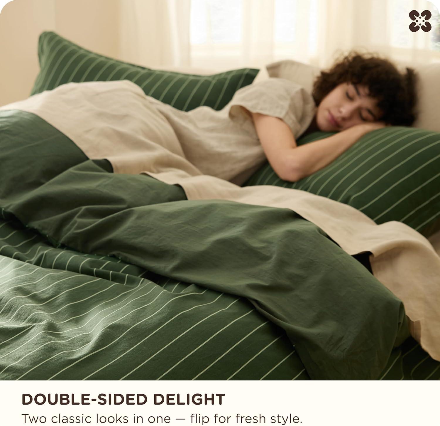 Bedsure 100% Washed Cotton Duvet Cover Queen Size, Classic Striped Duvet Cover Set Enhances Bedroom Comfort and Style, GentleSoft™ and Breathable Bedding Set, Stripes Tan/White, 90"x90"(03 - Stripes - Olive Green (No Comforter))