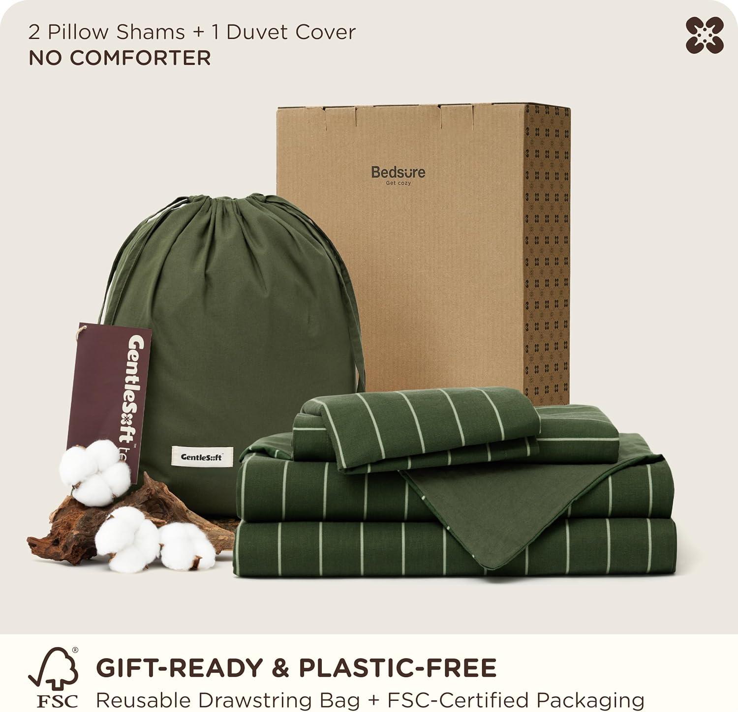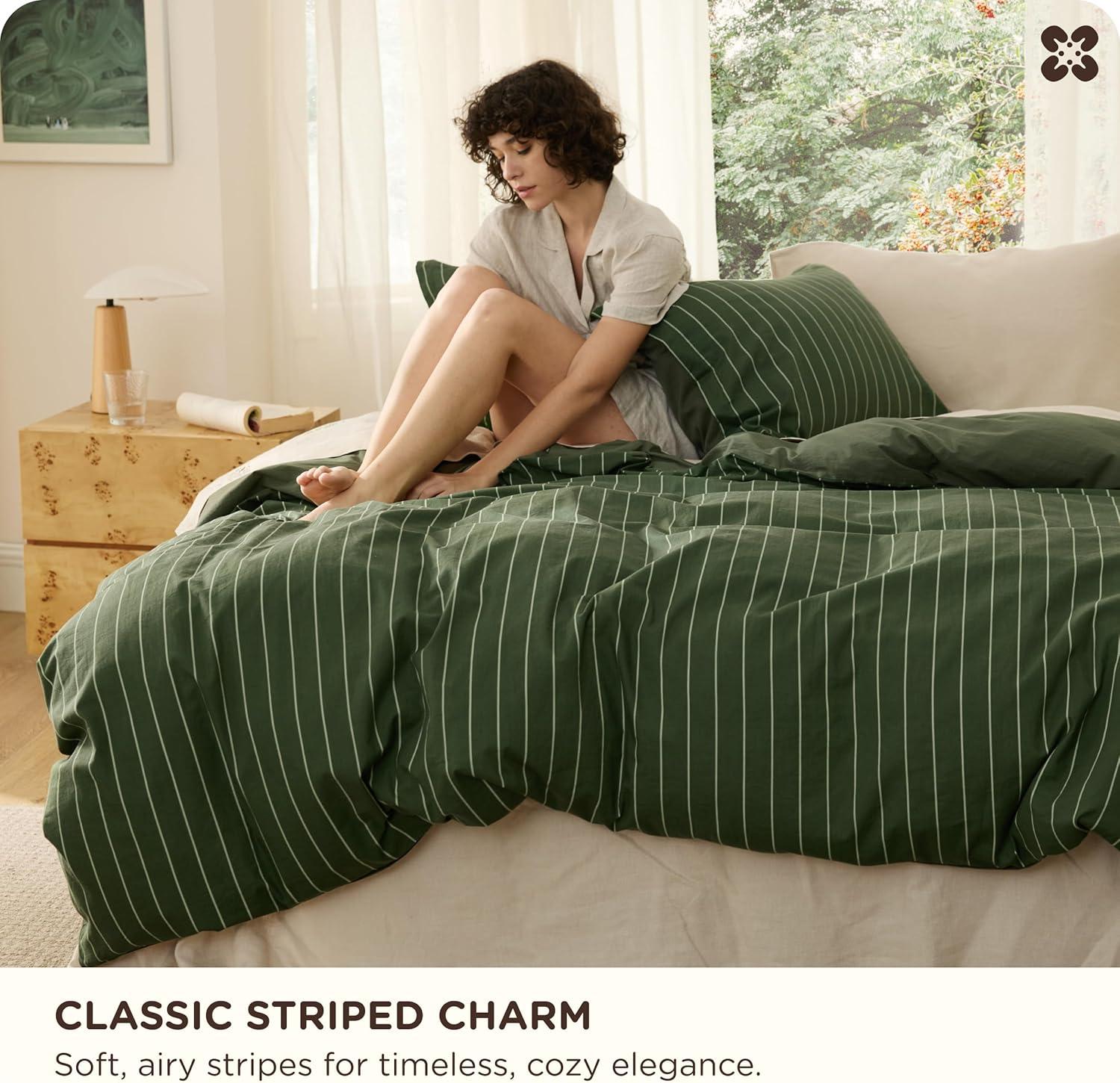 Bedsure 100% Washed Cotton Duvet Cover Queen Size, Classic Striped Duvet Cover Set Enhances Bedroom Comfort and Style, GentleSoft™ and Breathable Bedding Set, Stripes Tan/White, 90″x90″(03 – Stripes – Olive Green (No Comforter))