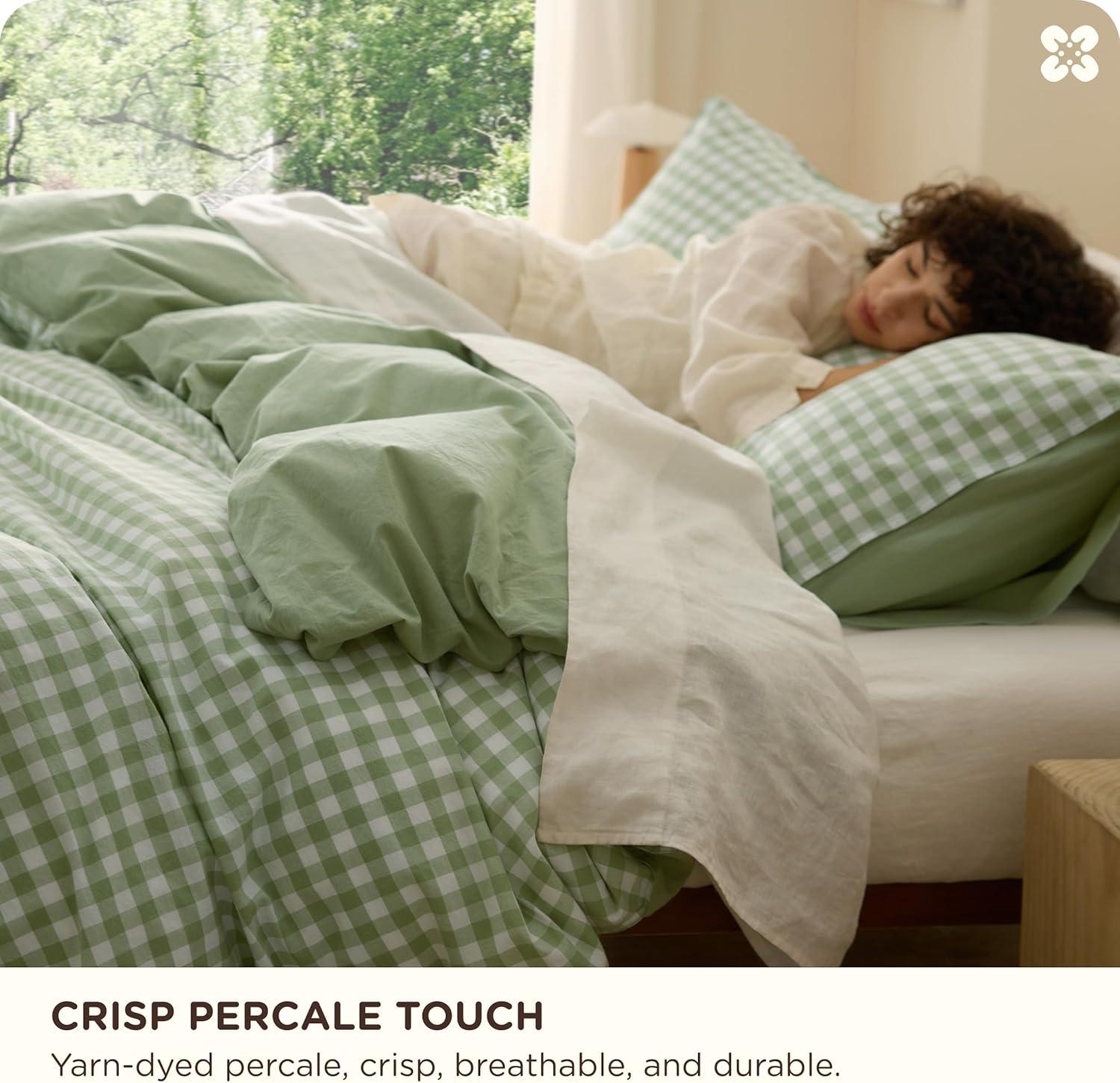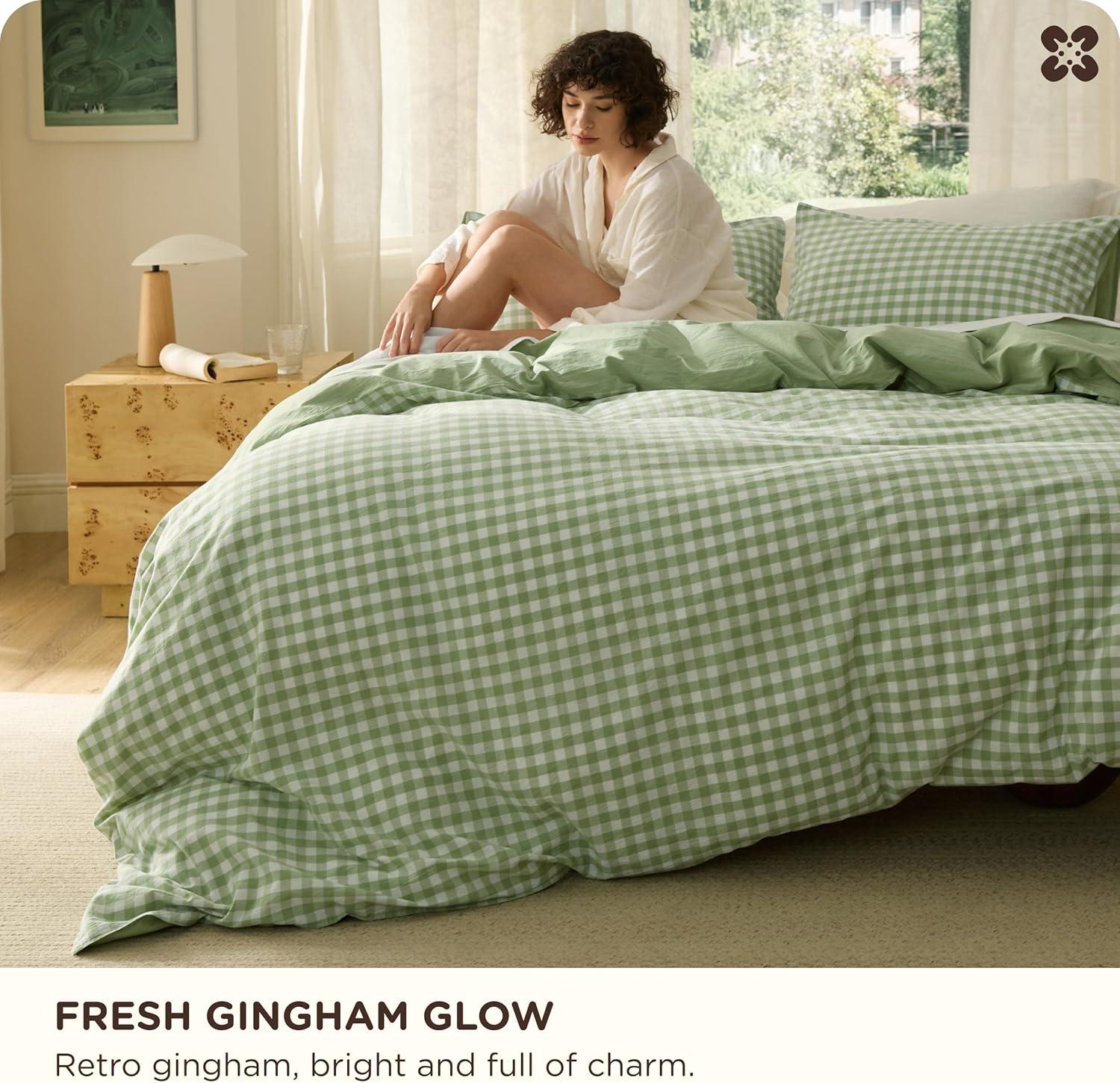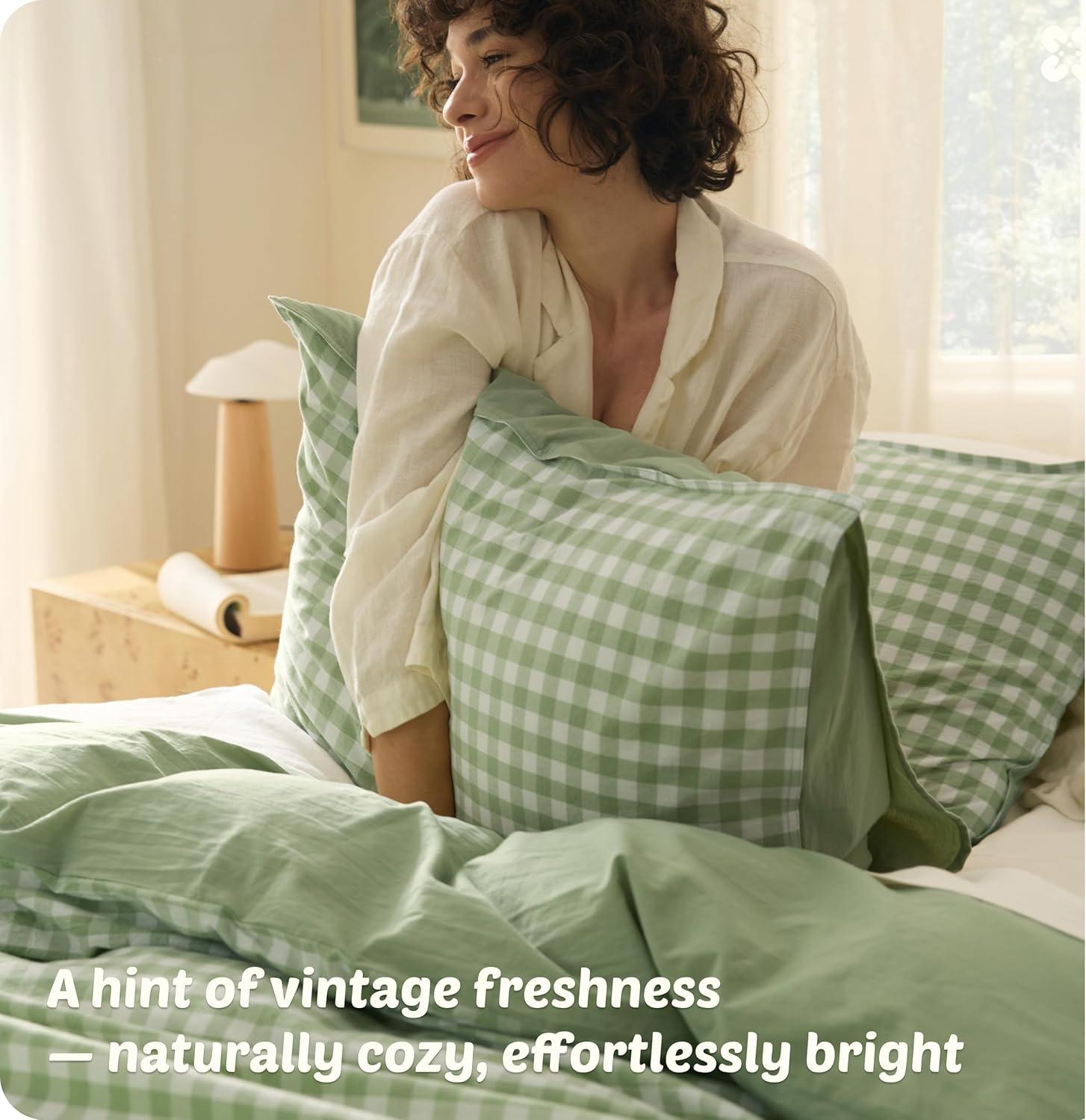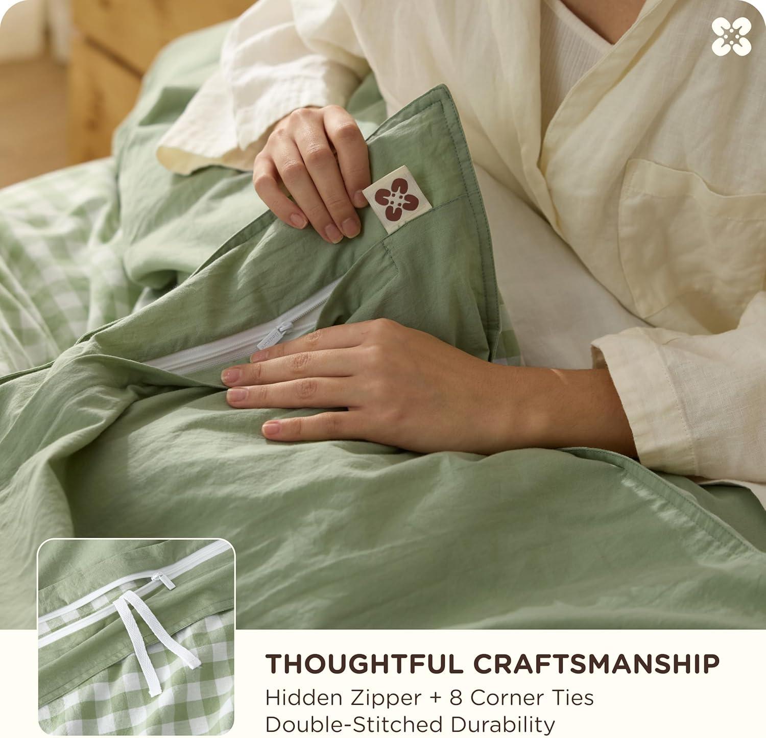 Bedsure 100% Washed Cotton Duvet Cover Queen Size, Classic Striped Duvet Cover Set Enhances Bedroom Comfort and Style, GentleSoft™ and Breathable Bedding Set, Stripes Tan/White, 90″x90″(06 – Gingham – Sage Green (No Comforter))
