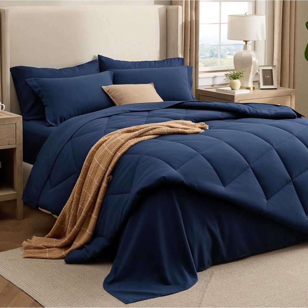 Bedsure 7 Pieces Queen Comforter Set Premium Series, Hotel Luxury Soft Bed in a Bag, Goose Down Alternative, Safe for Sensitive Skin Bedding Comforter All Season Medium Warmth, Navy Blue Queen Size,(01 – Black)