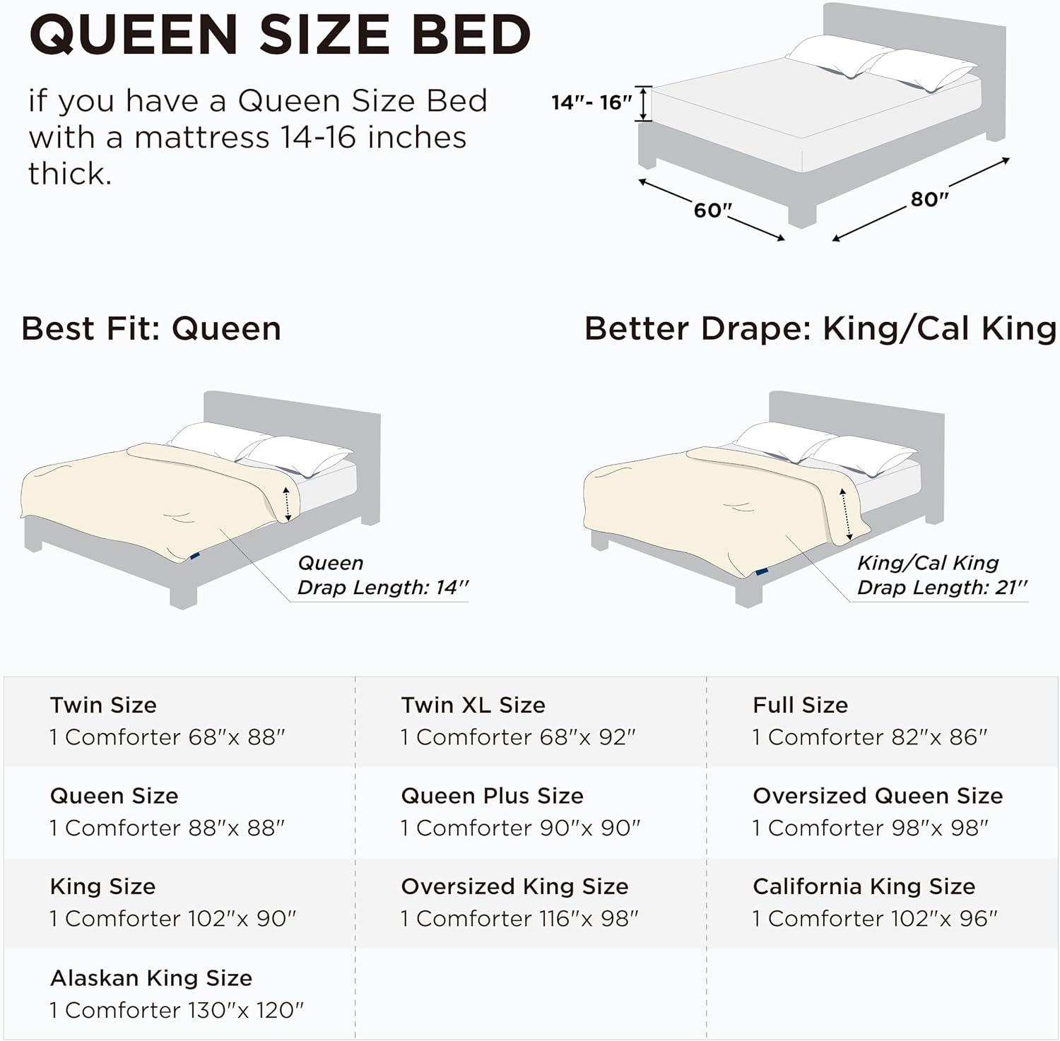 The Bedsure Down Alternative Comforters are available in multiple sizes, including Twin (68″x88″), Twin XL (68″x92″), Full (82″x86″), Queen (88″x88″), Queen Plus (90″x90″), Oversized Queen(98″ x 98″), King (102″x90″), Cal King (102″x96″), Oversized King(116″ x 98″) and Alaskan King(120″x130″)