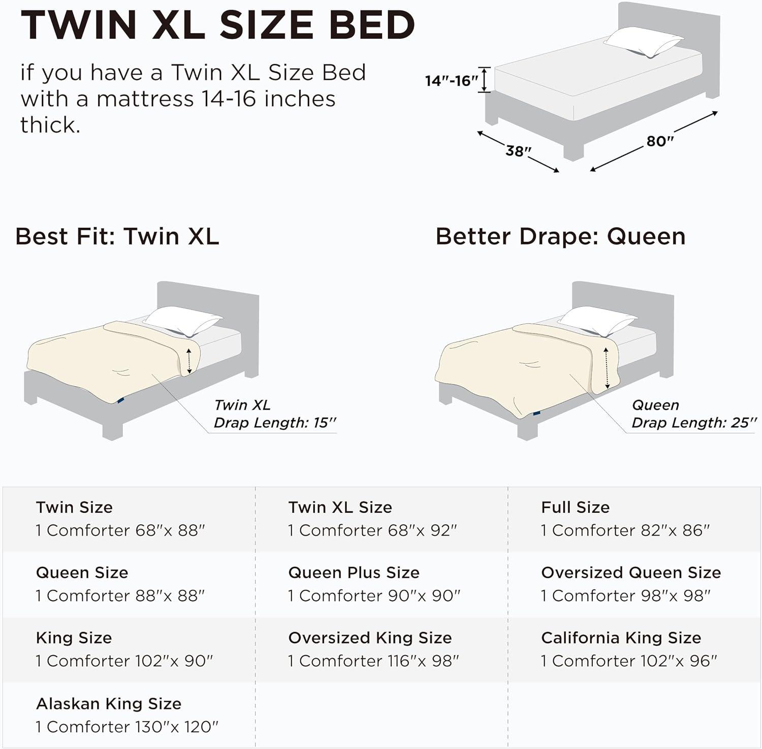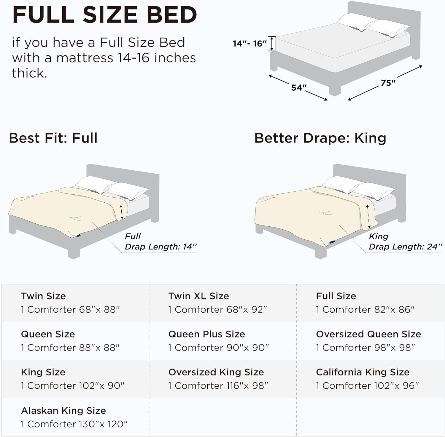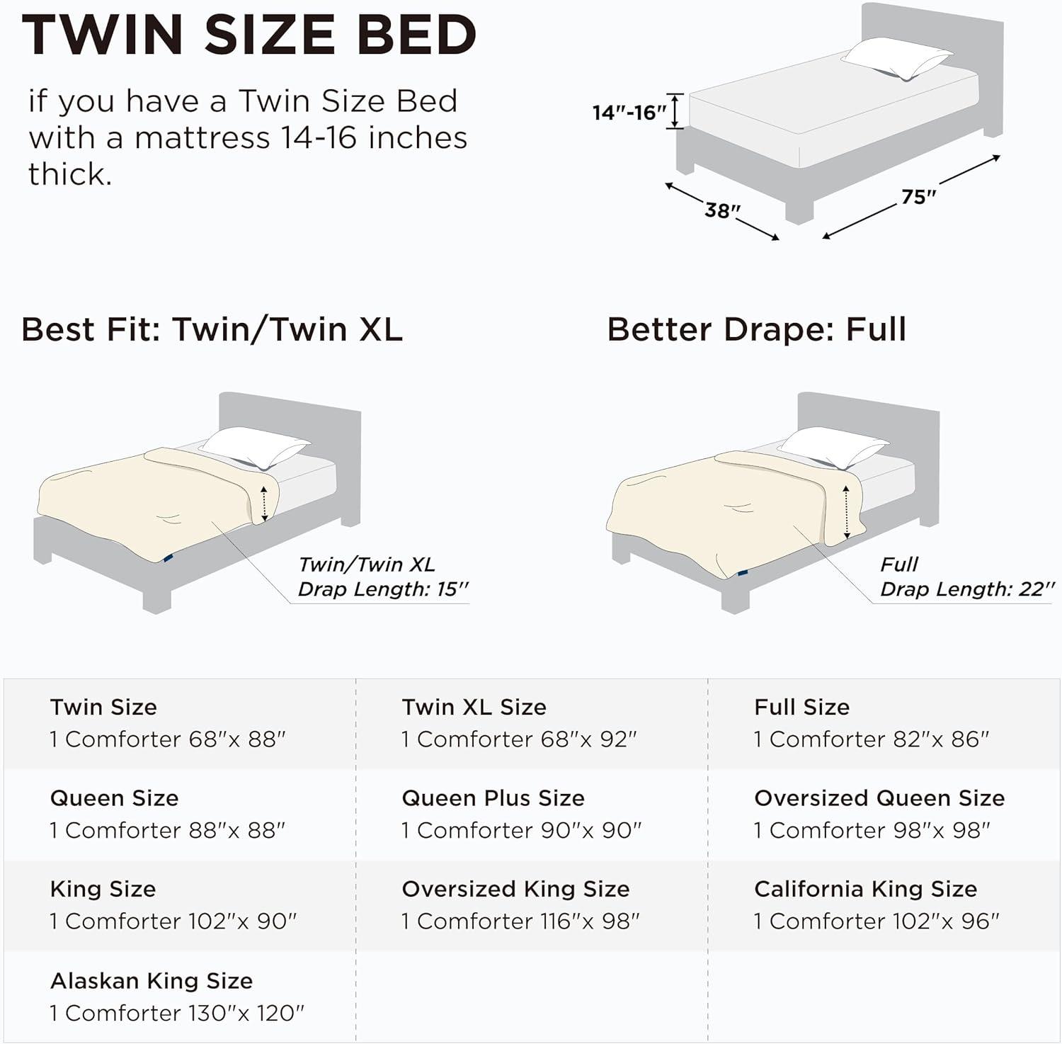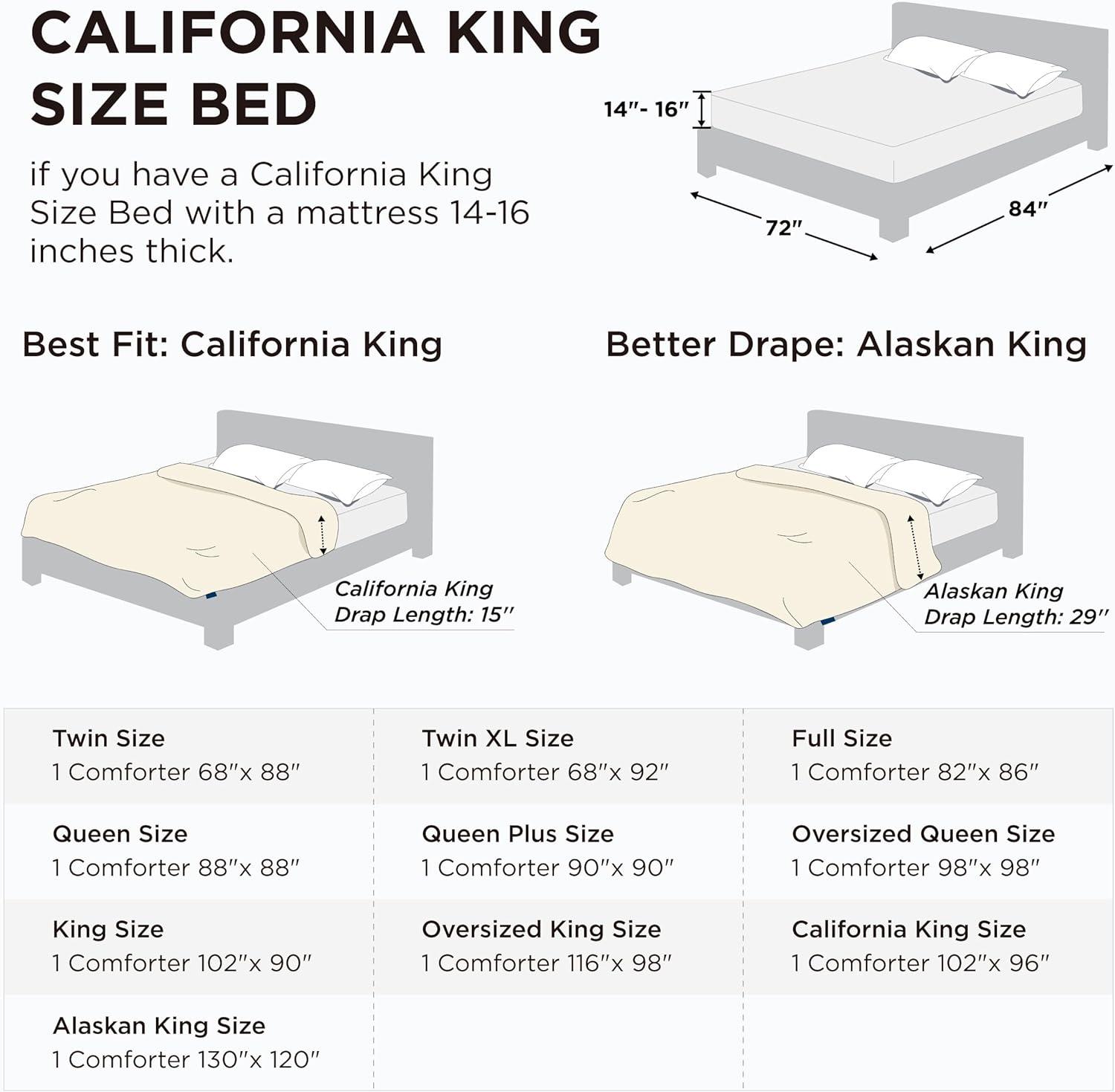 The Bedsure Down Alternative Comforters are available in multiple sizes, including Twin (68″x88″), Twin XL (68″x92″), Full (82″x86″), Queen (88″x88″), Queen Plus (90″x90″), Oversized Queen(98″ x 98″), King (102″x90″), Cal King (102″x96″), Oversized King(116″ x 98″) and Alaskan King(120″x130″)