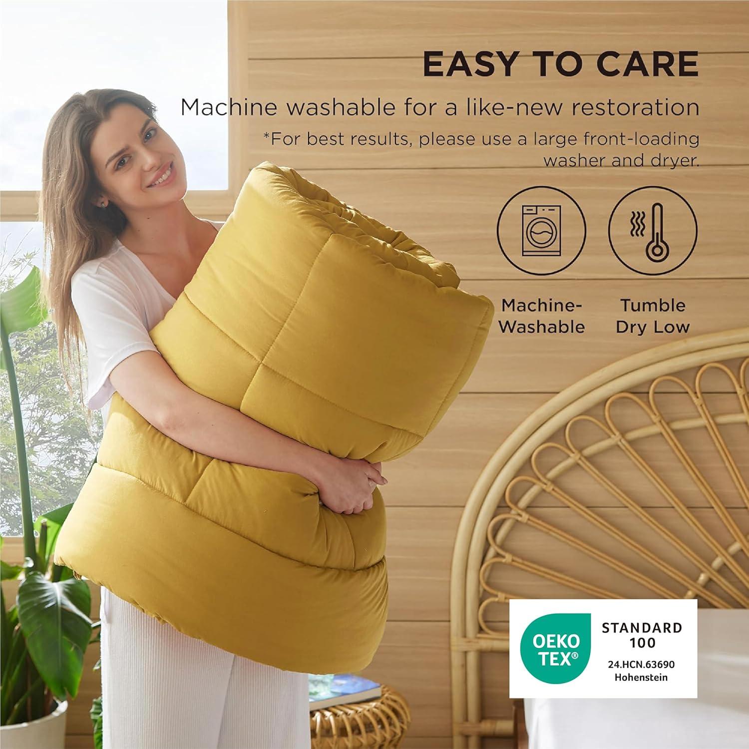 EASY TO CARE:Please gently fluff the comforter and let it rest for up to 24-48 hours after taking it out of the box to ensure maximum fluffiness. Machine wash separately in cold water on a gentle cycle and tumble dry low for a like-new restoration
