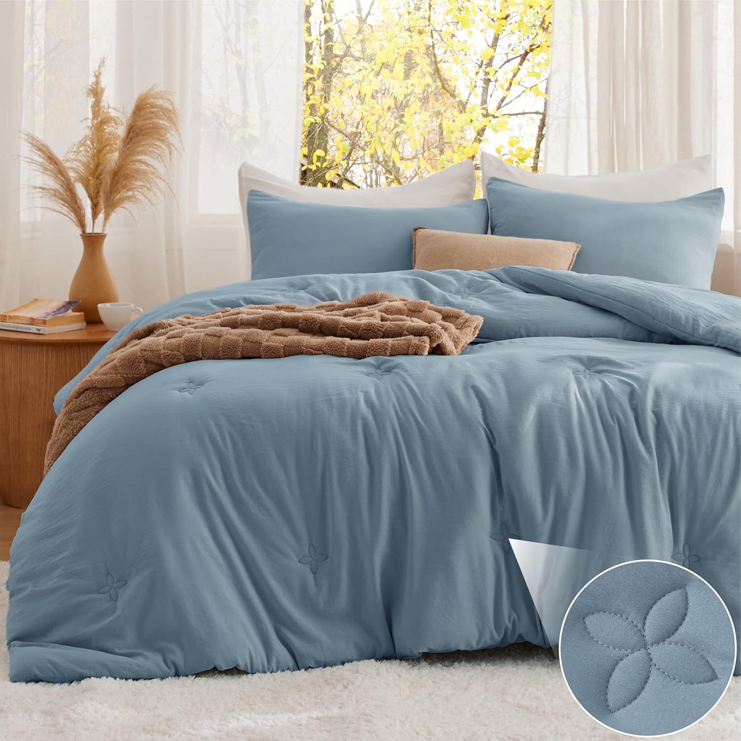 imageBedsure Comforter with 2 Pillow Shams Soft Prewashed Bedding Queen Size Quilted Comforter 90quotx90quot wiht Clover Design Beige Down Alternative Comforter for All Seasons 3 Pieces04mineral Blueclover