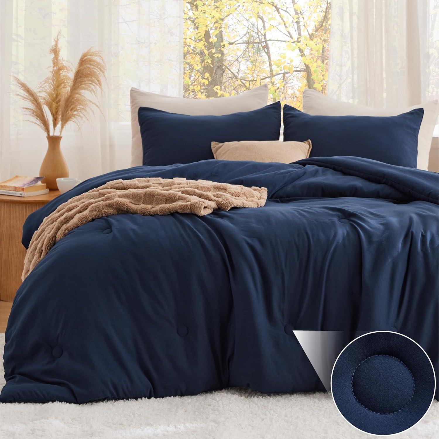 Bedsure Comforter with 2 Pillow Shams, Soft Prewashed Bedding Queen Size, Quilted Comforter (90"x90") wiht Clover Design, Beige Down Alternative Comforter for All Seasons, 3 Pieces(07-navy-circle)
