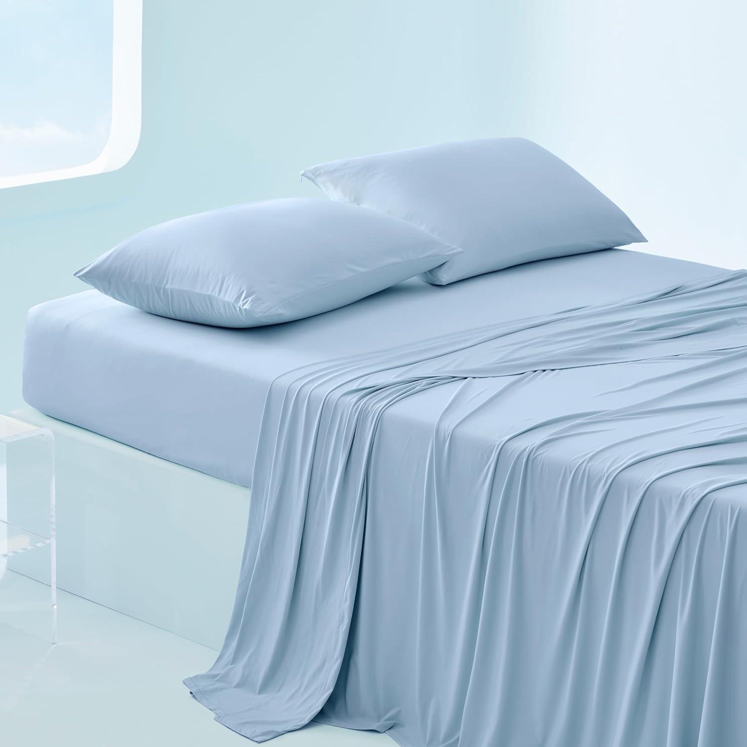 Bedsure Cooling Sheets Queen Size, Cooling Bed Sheets for Hot Sleepers, Chill Cool Sheet, Deep Pocket Up to 18 Inches, Soft & Breathable Queen Sheet Set, 4 Pieces, White(04 - Blue)
