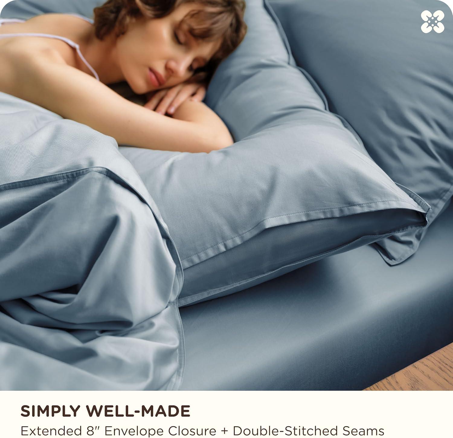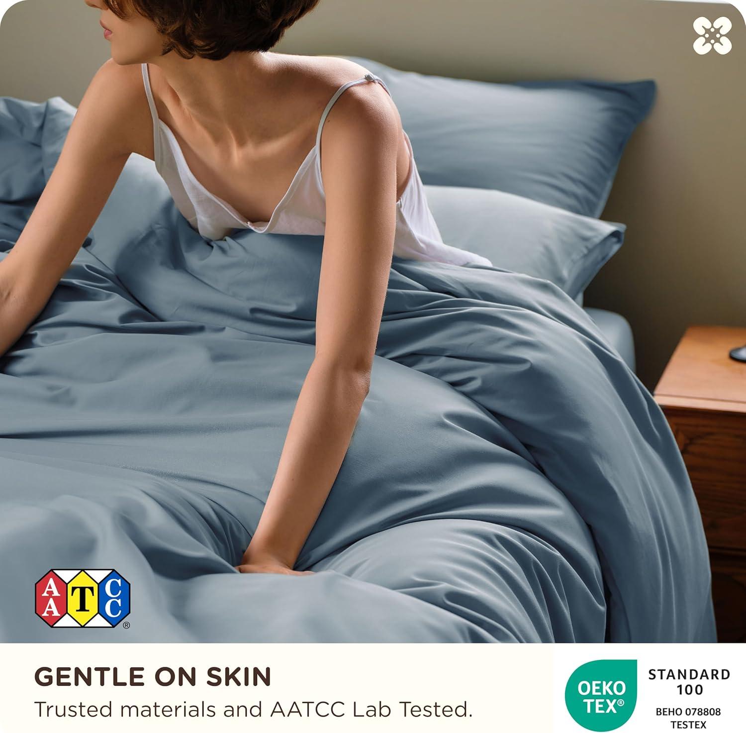 Long-Lasting & Easy Care: Featuring double-stitched edges and tightly woven 300TC sateen fabric for enhanced strength and durability. Lab-tested seam strength of 15.3 lbf ensures long-lasting performance. This organic cotton queen duvet cover set is easy to maintain—machine wash cold, tumble dry low, and remove promptly to minimize wrinkles
