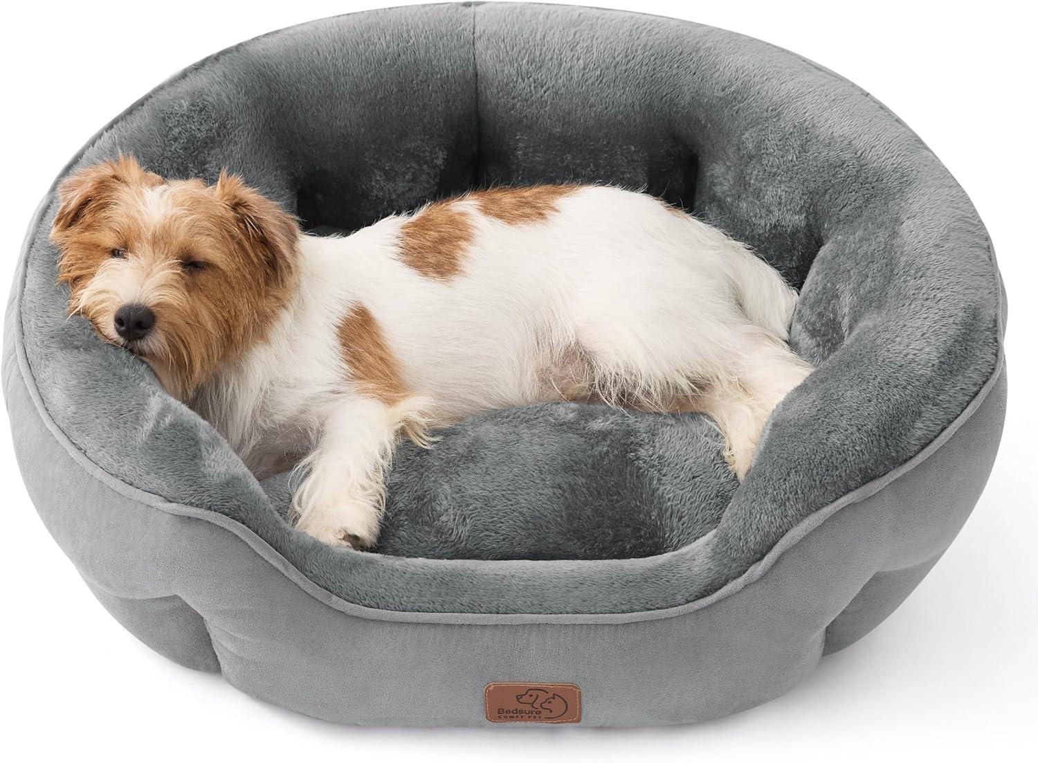 Bedsure Dog Bed for Medium Dogs – Round Washable Medium Pet Bed, Anti-Slip Donut Fluffy Plush Indoor Fur Cat Bed, 28 inches, Camel(Grey)