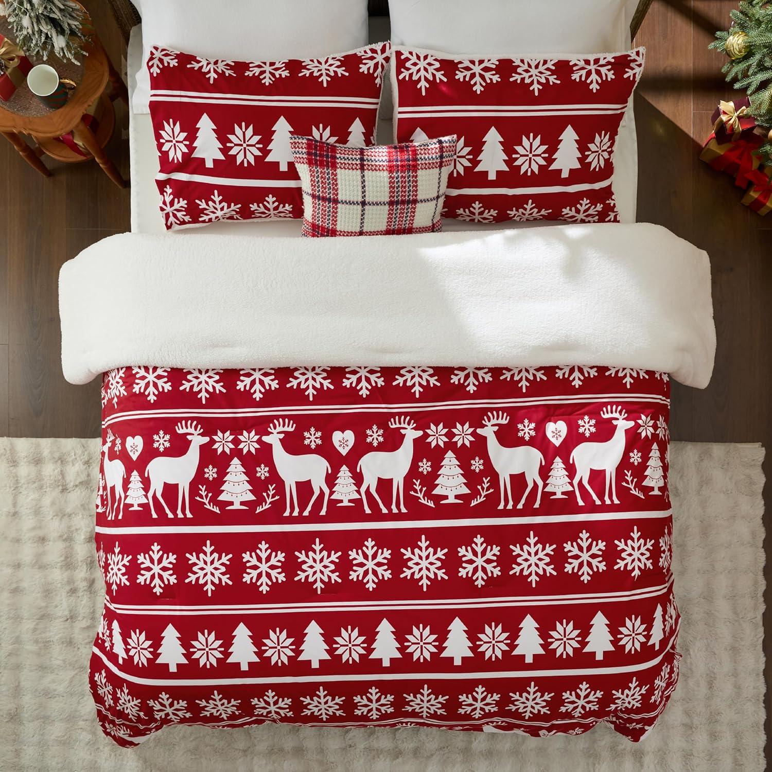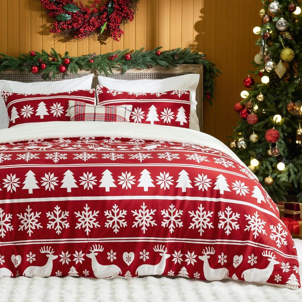Bedsure Fluffy Christmas Comforter Set Queen – Red Christmas Bedding with Candy Cane, Warm Fleece Bed Sets for Winter, 3 Pieces, 1 Soft Plush Shaggy Comforter with 2 Pillowcases(04 – Red Deer)