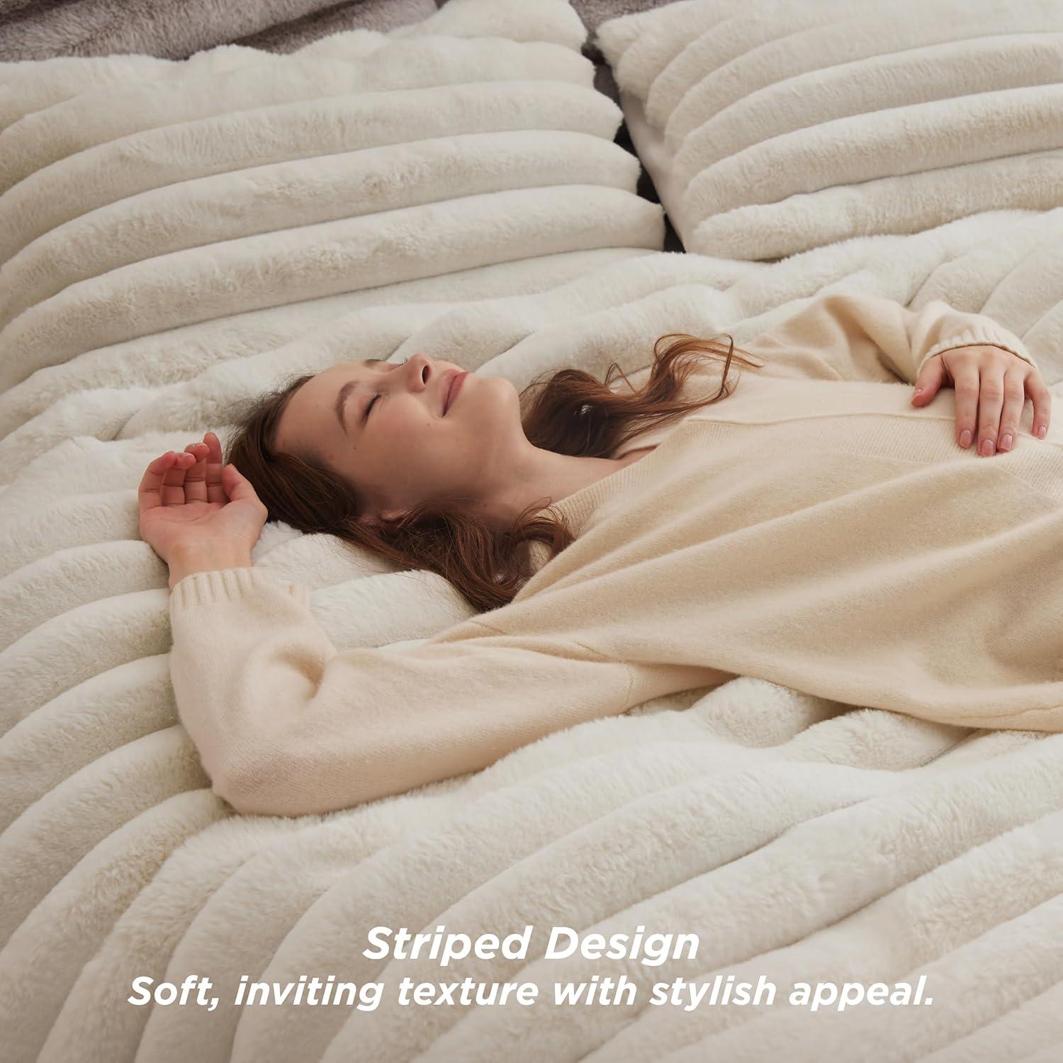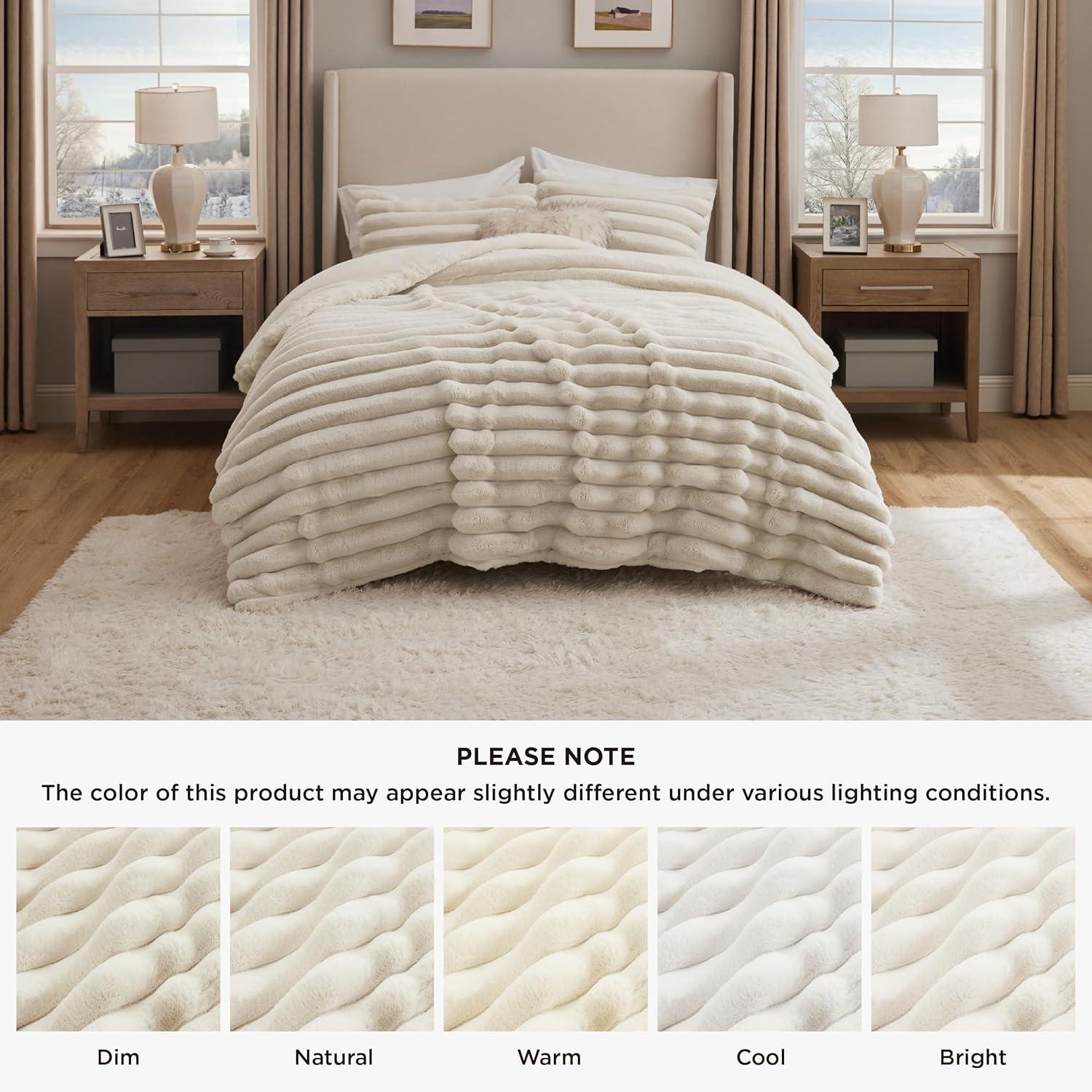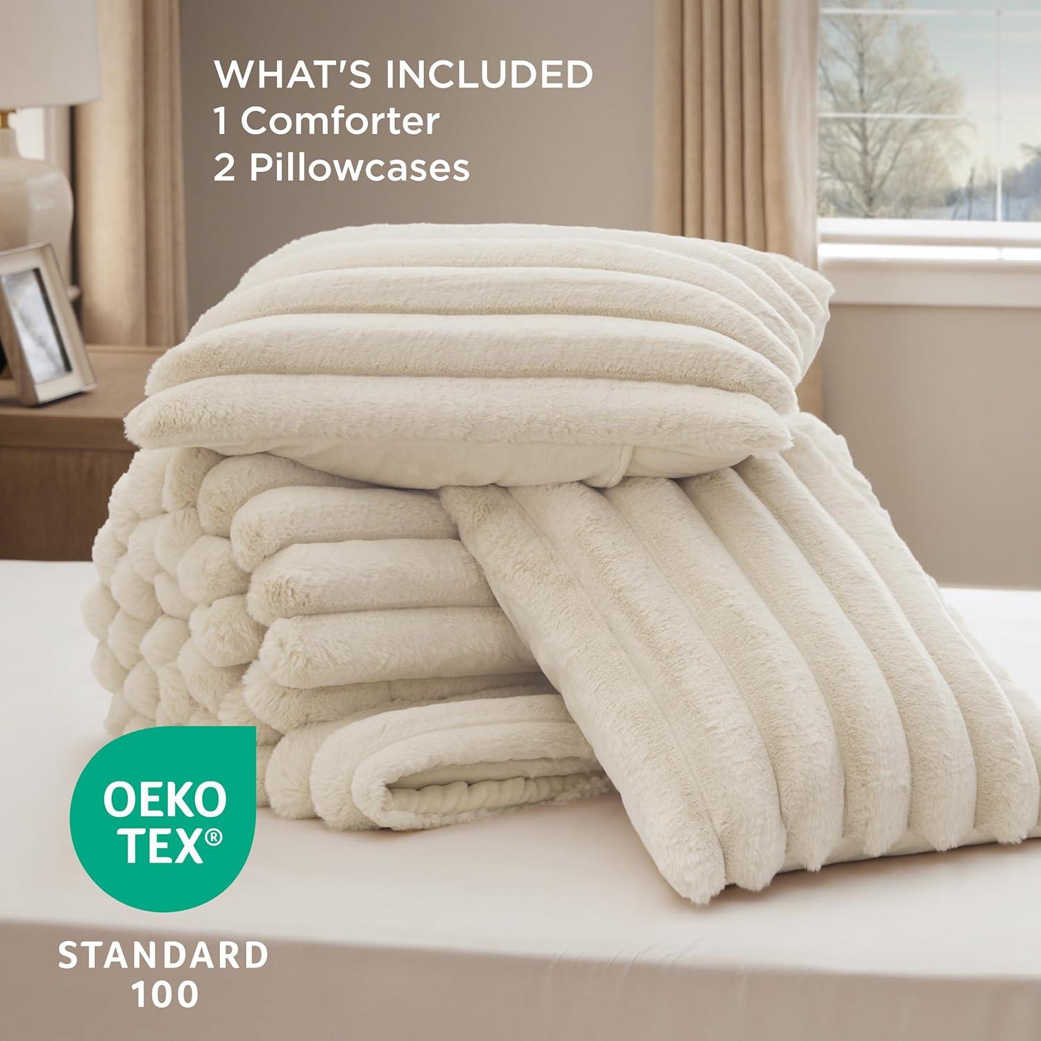 Dual-Texture Comfort: The sleeping side is crafted from solid-color ultra-soft microfiber, providing a smooth, warm surface that is gentle against the skin, perfect for a cozy night's sleep. The other side is made from carved vegan fur, delivering an exceptionally plush and soft texture that adds a luxurious feel to your bedding.Luxurious Design: This bedding set showcases a distinctive carved design with a three-dimensional look, offering a visually appealing and tactilely inviting texture that seamlessly combines style and comfort, making it an ideal addition to any bedroom decor.Premium Filling: Filled with premium down alternative fiber, this comforter offers optimal loft and warmth with a soft, fluffy texture that provides superior insulation for colder nights. The high-quality fill is highly resilient, maintaining its shape and offering excellent elasticity and compression resistance, ensuring lasting fluffiness and comfort.Easy to Maintain: This is easy to maintain and machine washable. Simply machine wash in cold water on a gentle cycle for a like-new restoration.Certified for Safety: This is Standard 100 by OEKO-TEX certified for meeting the highest testing criteria for harmful chemicals and has been found harmless for humans.What You Get: This queen comforter set includes 1 comforter (90″ x 90″) and 2 pillowcases (20″ x 26″), providing everything you need to turn your bed into a cozy and inviting sleep space with comfort and warmth for all seasons.