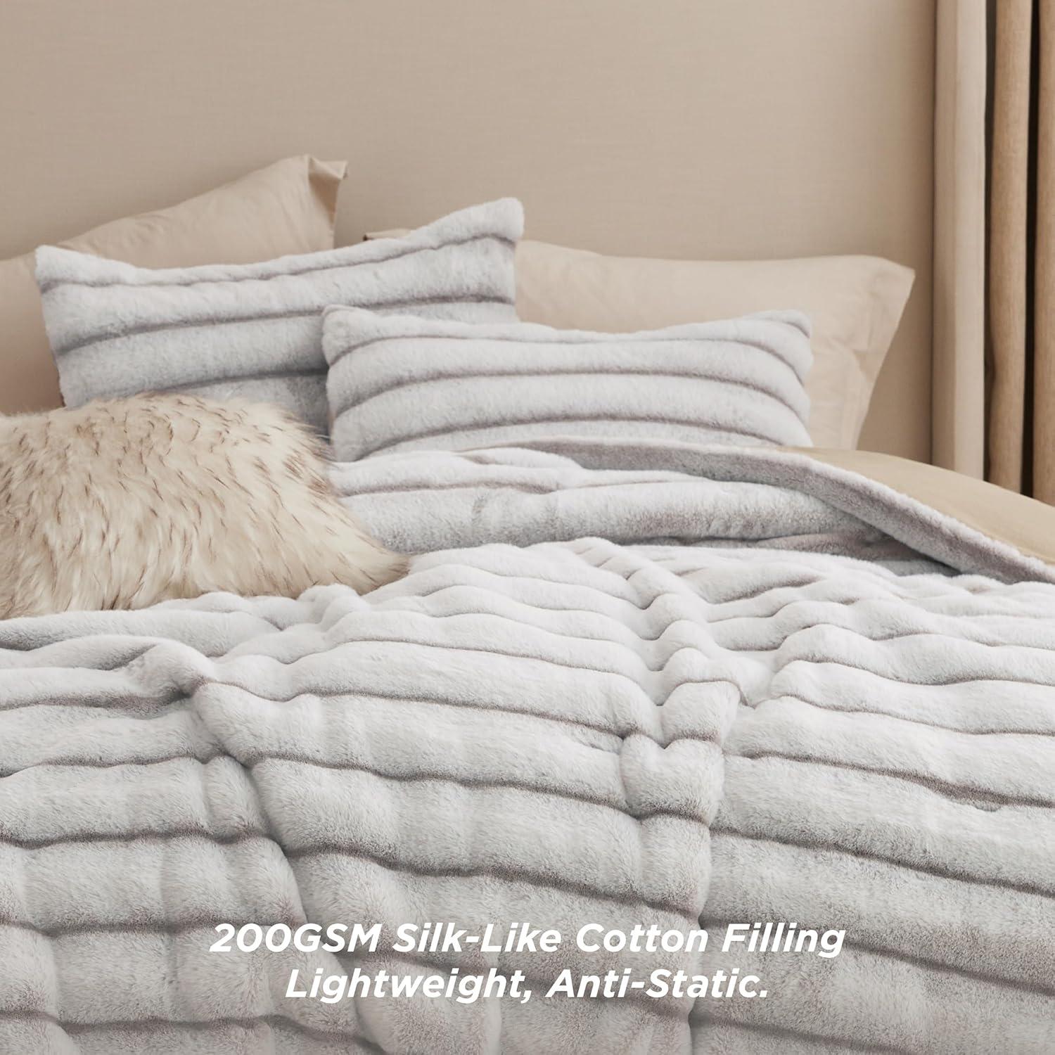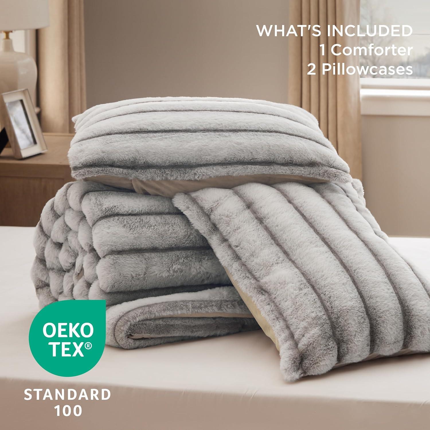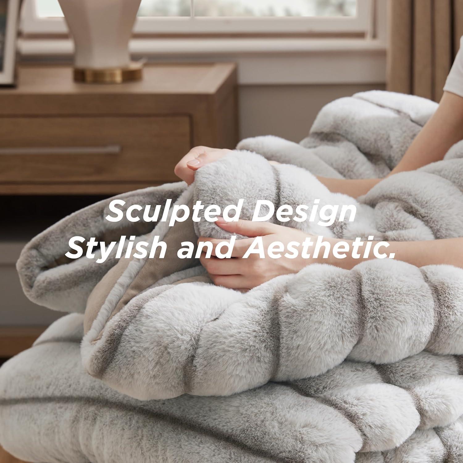 Dual-Texture Comfort: The sleeping side is crafted from solid-color ultra-soft microfiber, providing a smooth, warm surface that is gentle against the skin, perfect for a cozy night's sleep. The other side is made from carved vegan fur, delivering an exceptionally plush and soft texture that adds a luxurious feel to your bedding.Luxurious Design: This bedding set showcases a distinctive carved design with a three-dimensional look, offering a visually appealing and tactilely inviting texture that seamlessly combines style and comfort, making it an ideal addition to any bedroom decor.Premium Filling: Filled with premium down alternative fiber, this comforter offers optimal loft and warmth with a soft, fluffy texture that provides superior insulation for colder nights. The high-quality fill is highly resilient, maintaining its shape and offering excellent elasticity and compression resistance, ensuring lasting fluffiness and comfort.Easy to Maintain: This is easy to maintain and machine washable. Simply machine wash in cold water on a gentle cycle for a like-new restoration.Certified for Safety: This is Standard 100 by OEKO-TEX certified for meeting the highest testing criteria for harmful chemicals and has been found harmless for humans.What You Get: This queen comforter set includes 1 comforter (90″ x 90″) and 2 pillowcases (20″ x 26″), providing everything you need to turn your bed into a cozy and inviting sleep space with comfort and warmth for all seasons.