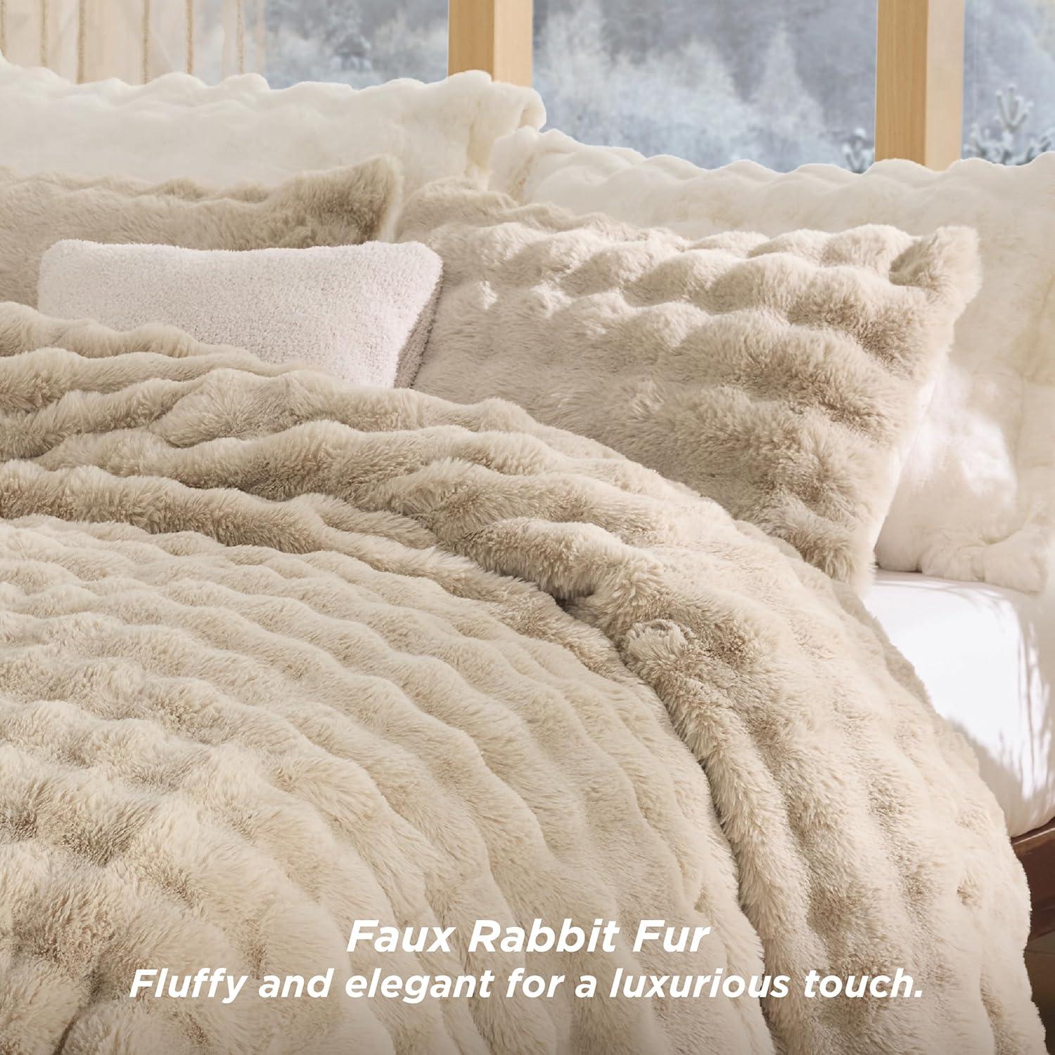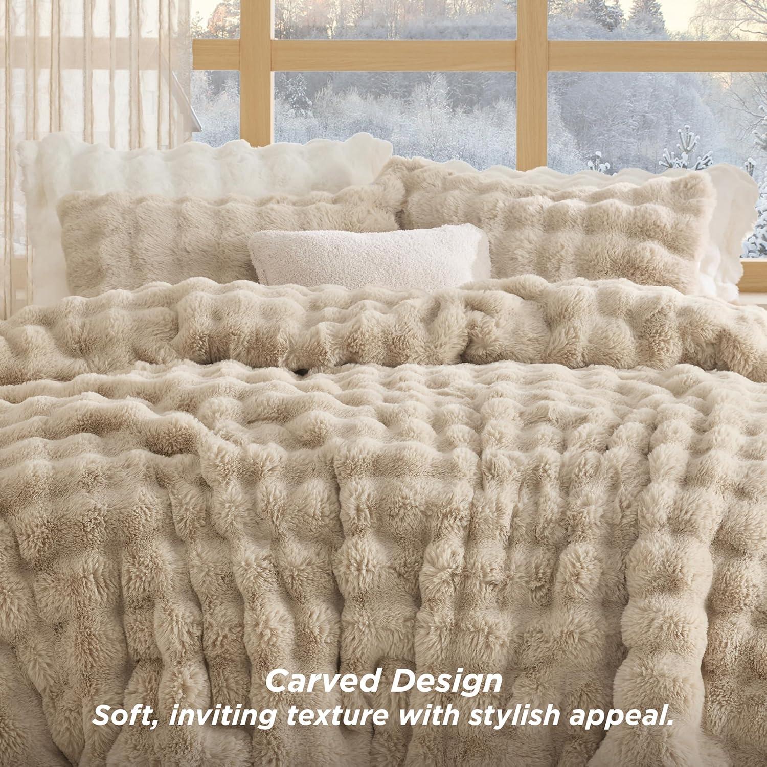 Dual-Texture Comfort: The sleeping side is crafted from solid-color ultra-soft microfiber, providing a smooth, warm surface that is gentle against the skin, perfect for a cozy night's sleep. The other side is made from carved vegan fur, delivering an exceptionally plush and soft texture that adds a luxurious feel to your bedding.Luxurious Design: This bedding set showcases a distinctive carved design with a three-dimensional look, offering a visually appealing and tactilely inviting texture that seamlessly combines style and comfort, making it an ideal addition to any bedroom decor.Premium Filling: Filled with premium down alternative fiber, this comforter offers optimal loft and warmth with a soft, fluffy texture that provides superior insulation for colder nights. The high-quality fill is highly resilient, maintaining its shape and offering excellent elasticity and compression resistance, ensuring lasting fluffiness and comfort.Easy to Maintain: This is easy to maintain and machine washable. Simply machine wash in cold water on a gentle cycle for a like-new restoration.Certified for Safety: This is Standard 100 by OEKO-TEX certified for meeting the highest testing criteria for harmful chemicals and has been found harmless for humans.What You Get: This queen comforter set includes 1 comforter (90″ x 90″) and 2 pillowcases (20″ x 26″), providing everything you need to turn your bed into a cozy and inviting sleep space with comfort and warmth for all seasons.