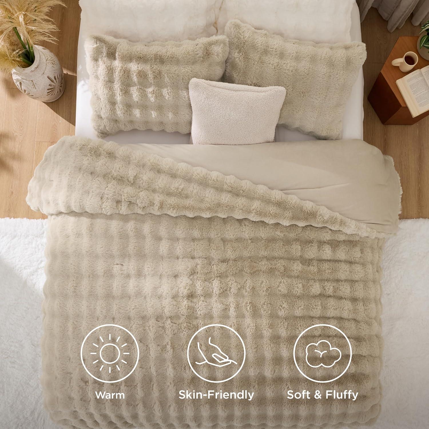 Bedsure Fluffy Comforter Set Queen - Light Beige Faux Fur Queen Comforter, Soft Shaggy Plush Bubble Bedding Comforter Sets, Winter Warm Luxury Fuzzy Bed Set 3 Pieces, 1 Comforter and 2 Pillowcases(06 - Light Beige)