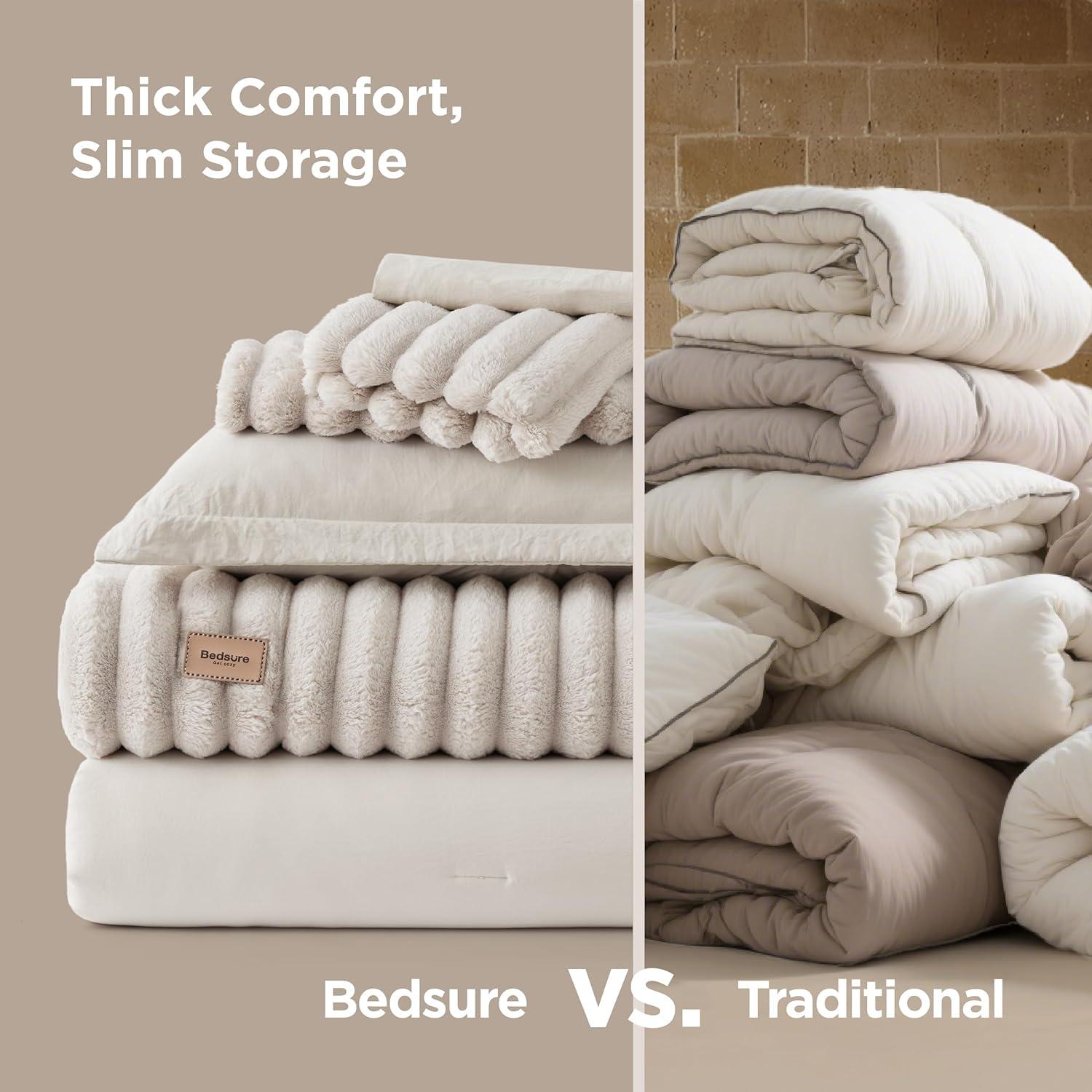 Bedsure Gentlesoft 2-in-1 Queen Comforter Set and Detachable Fluffy Blanket, Beige Bedding Set for All Season Use, SnapTech Design for Space Saving (Includes 2 Pillow Shams, 2 Pillowcases)(02 – White)