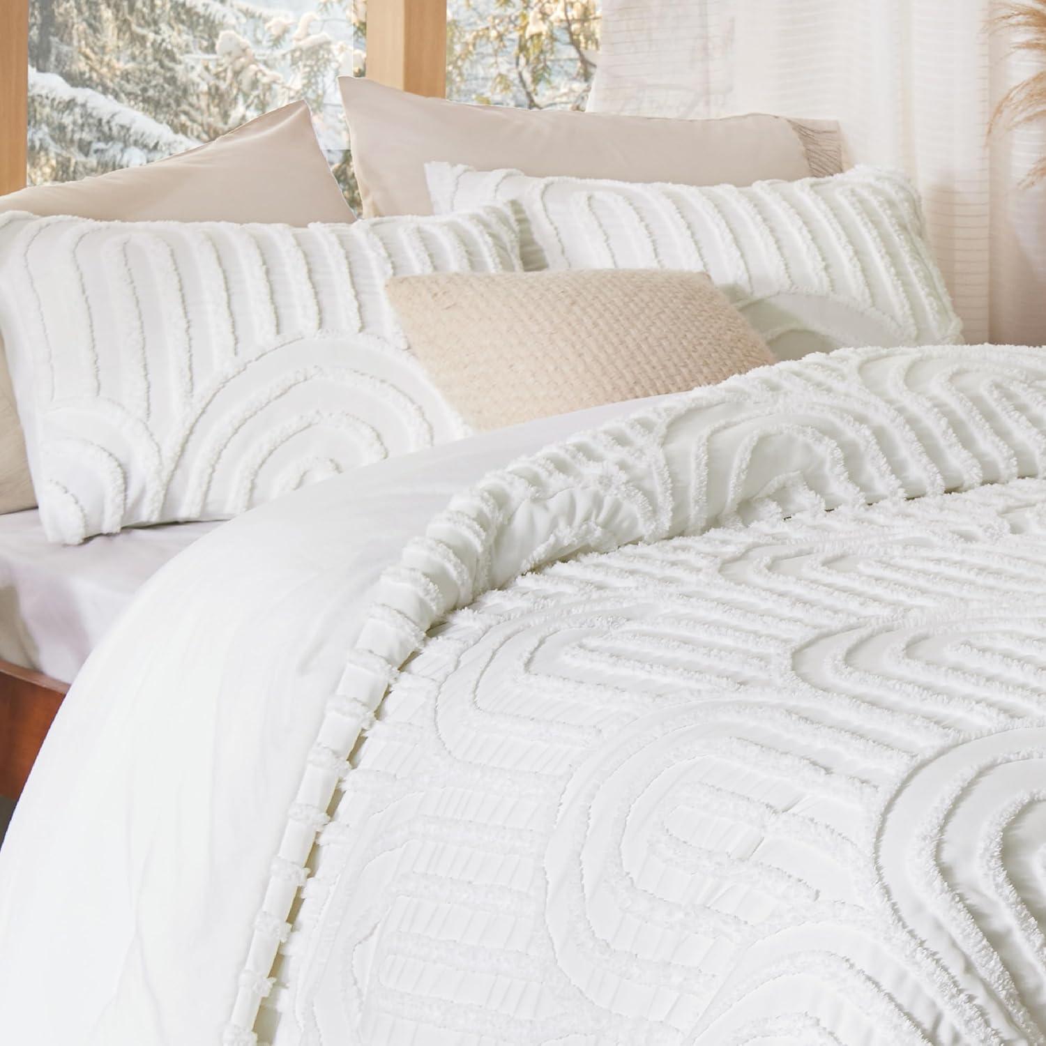 imageBedsure Queen Size Comforter Set  Beige Tufted Boho Bed Set Farmhouse Shabby Chic Embroidery Bedding for All Seasons 3 Pieces 1 Soft Jacquard Queen Comforter and 2 Pillow Shams02  White  Arch Jacquard