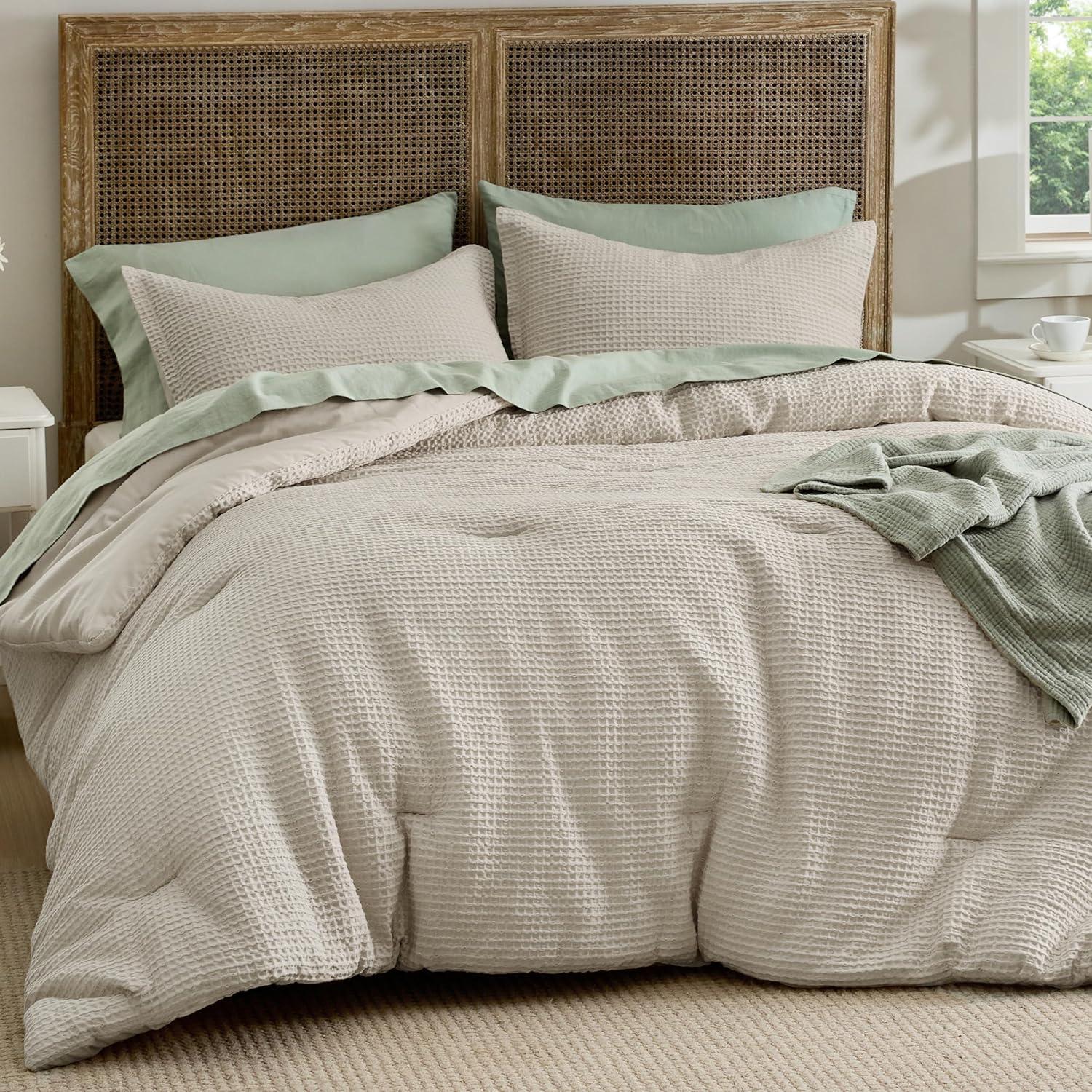 Bedsure Waffle Comforter Set King, Beige Soft Bedding, Waffle Weave Bed Set, 3 Pieces, 1 Comforter (104″x90″) and 2 Pillow Shams, Cotton Shell and Polyester Lining for All Seasons(08 – Linen)