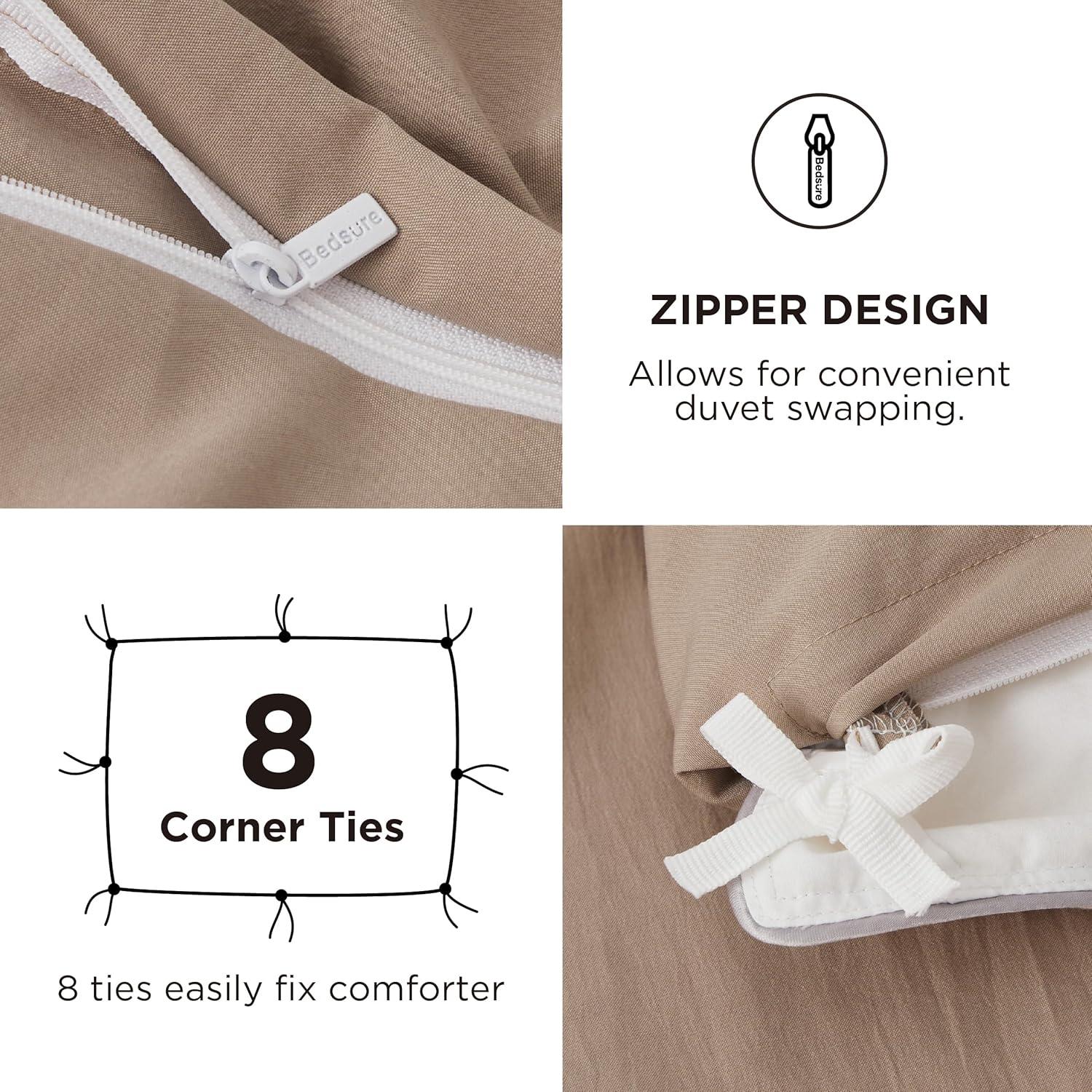 Thoughtful Details: Eight corner ties inside the duvet cover ensure a secure fit to prevent the filling from bunching. The zipper allows you to seal off your comforter more quickly (and easily) than with a traditional button closure.